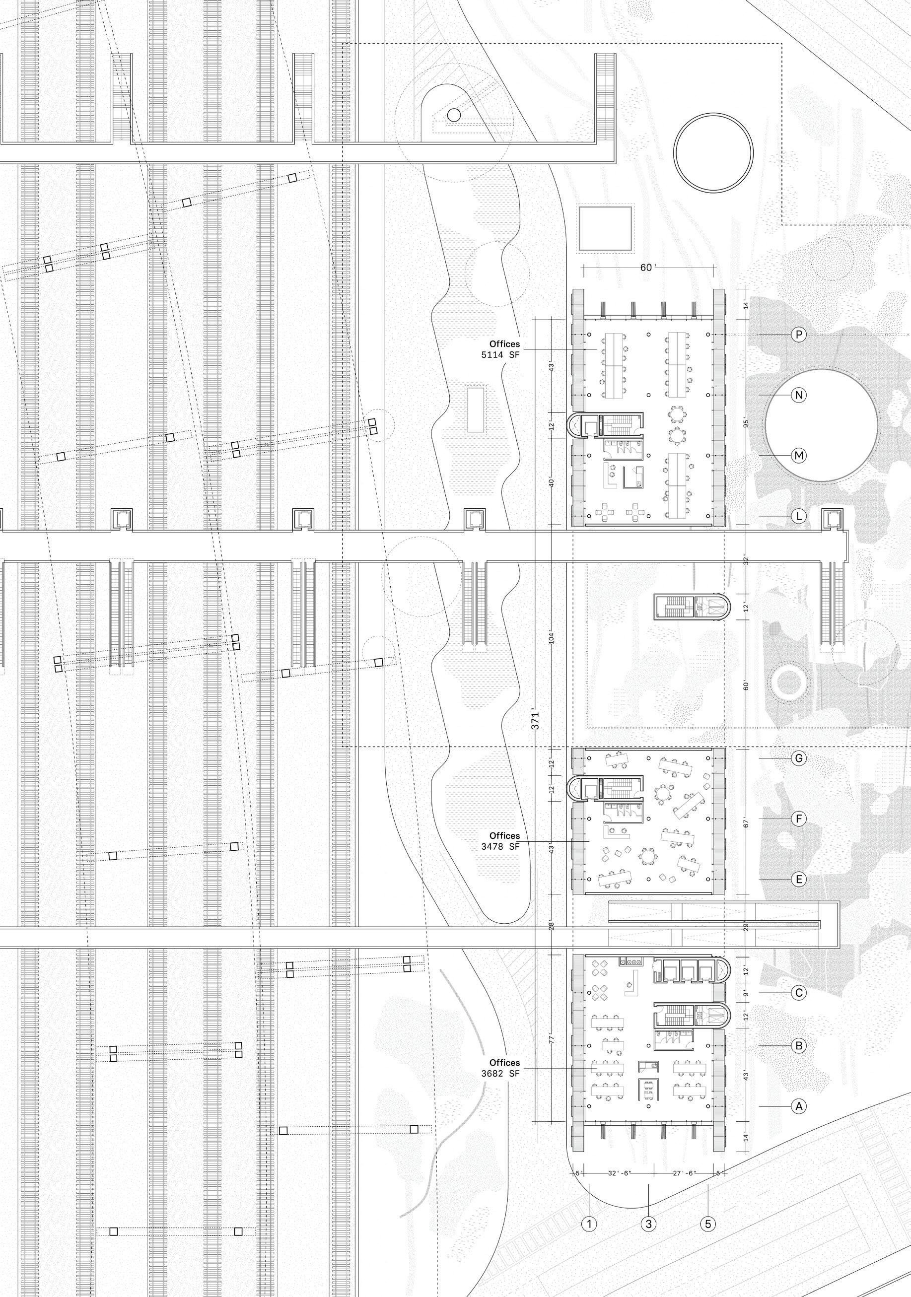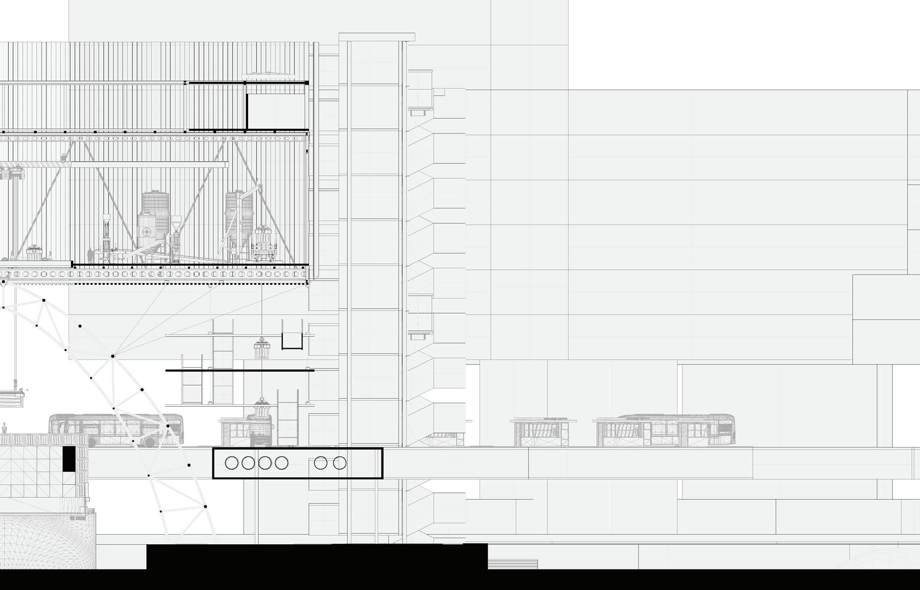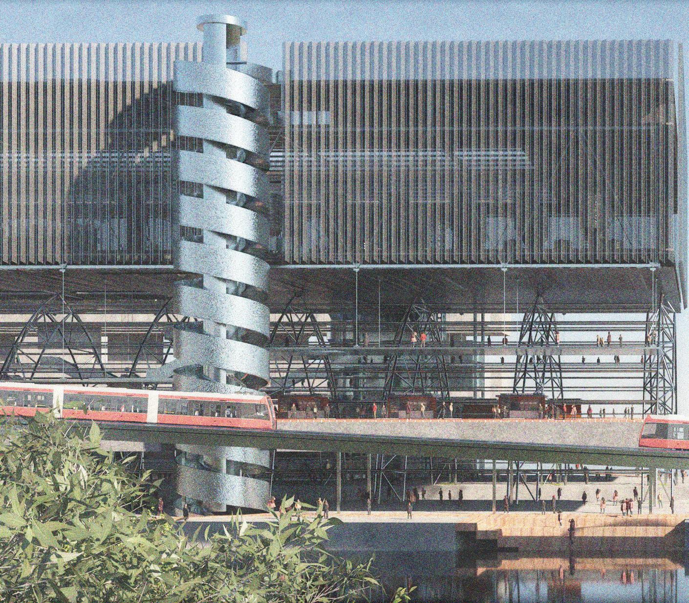The studio program was a mixed-use transit hub that could accommodate public and private mobility within a paradigm of infrastructural decarbonization. The social dimension of such a program required the students to think critically about spaces of mobility as places for democratic activity where strangers interact regardless