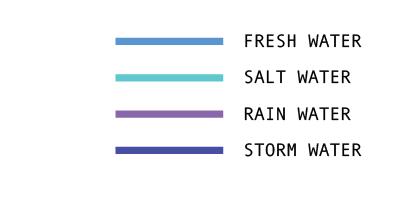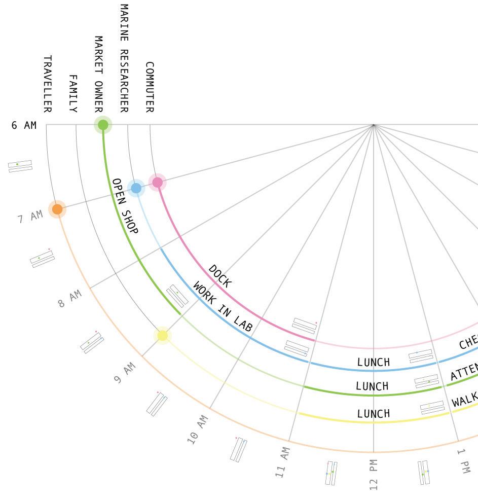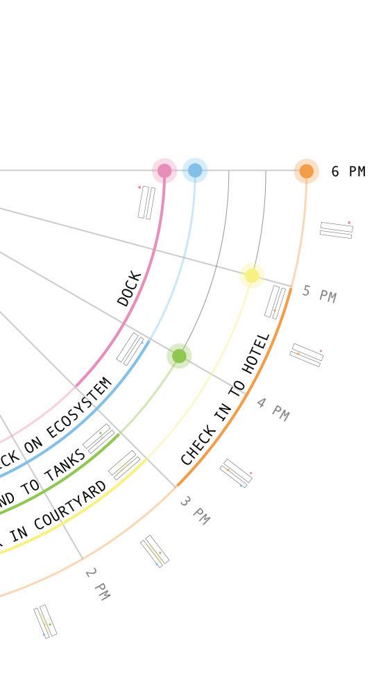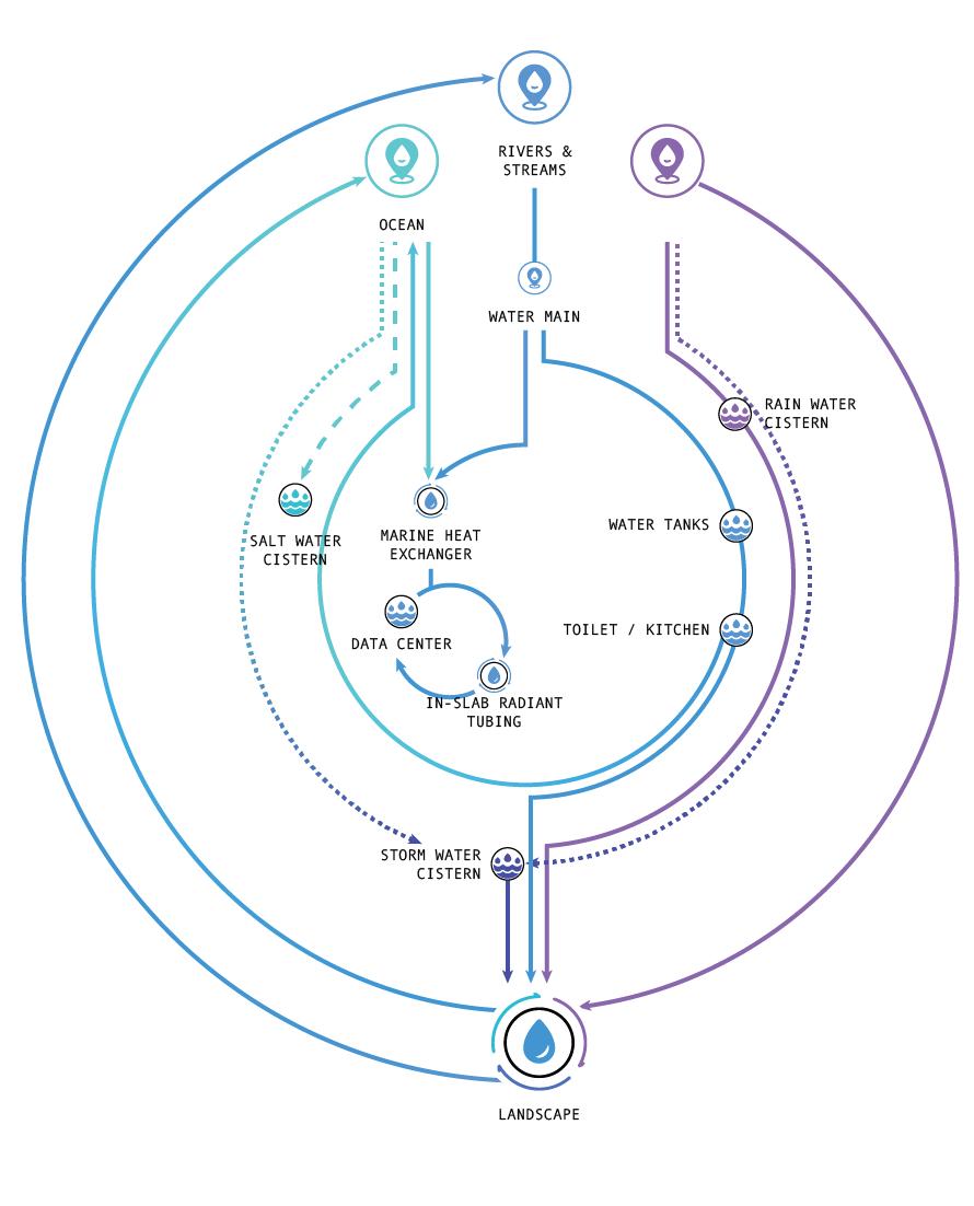 Diagrams (clockwise from above) demonstrate site program and systems in section view; the overlapping actors in the cycle of a typical day; a study model of life above and below sea level; a study of the water sources and flows throughout building architecture.