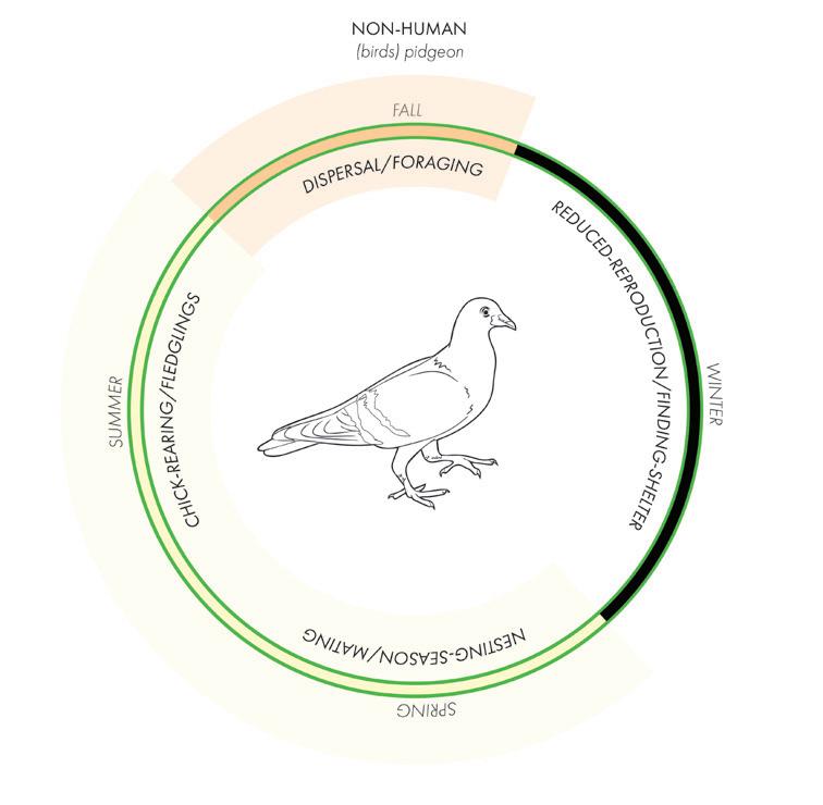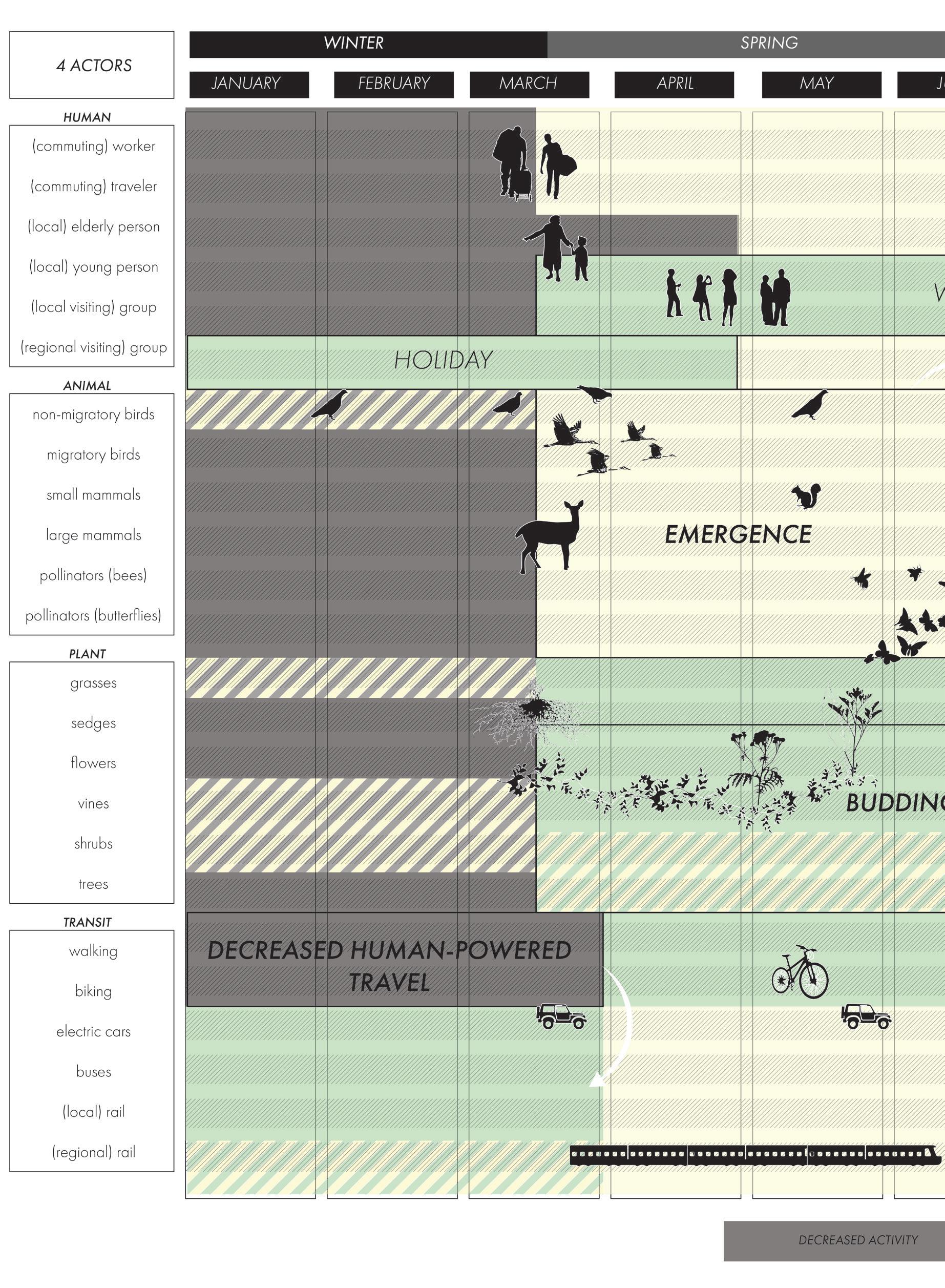 Many human and non-human actors, from birds to trains to commuters, occupy the site. Their interactions are carefully calibrated across season and time of day.