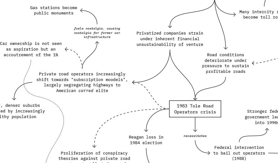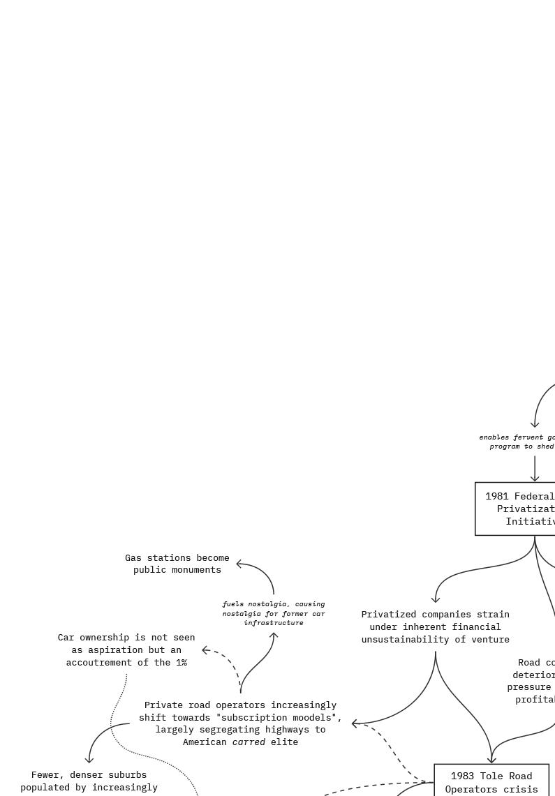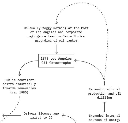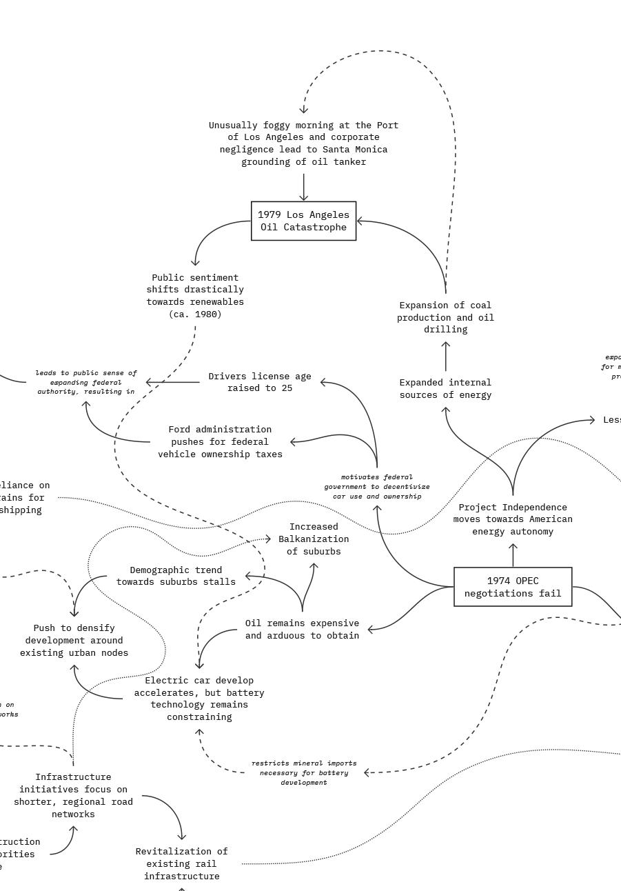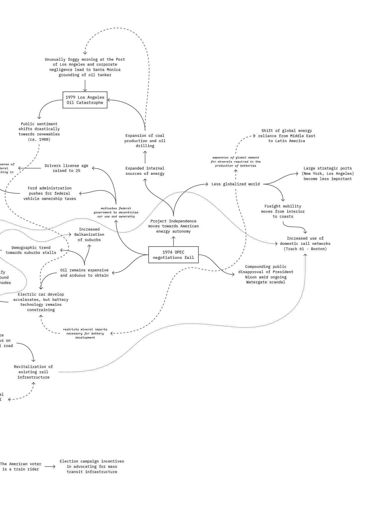 Contingencies surrounding the 1973 Oil Crisis serve as the conditions for our counterfactual game. OPEC’s oil embargo on the US and the Netherlands drove rapid and dramatic change in the ways in which fuel was consumed between 1973 and 1974. Fuel rationing, lower speed limits, and car-free mandates on mobility were suddenly on the table as ways to radically reduce dependence on cheap fossil fuels. While the impact of the crisis was lasting in its global impact, negotiations with OPEC in 1974 resulted in a lifting of the embargo. Ultimately, the impact on patterns of mobility and fuel use in the US were not dramatically altered.