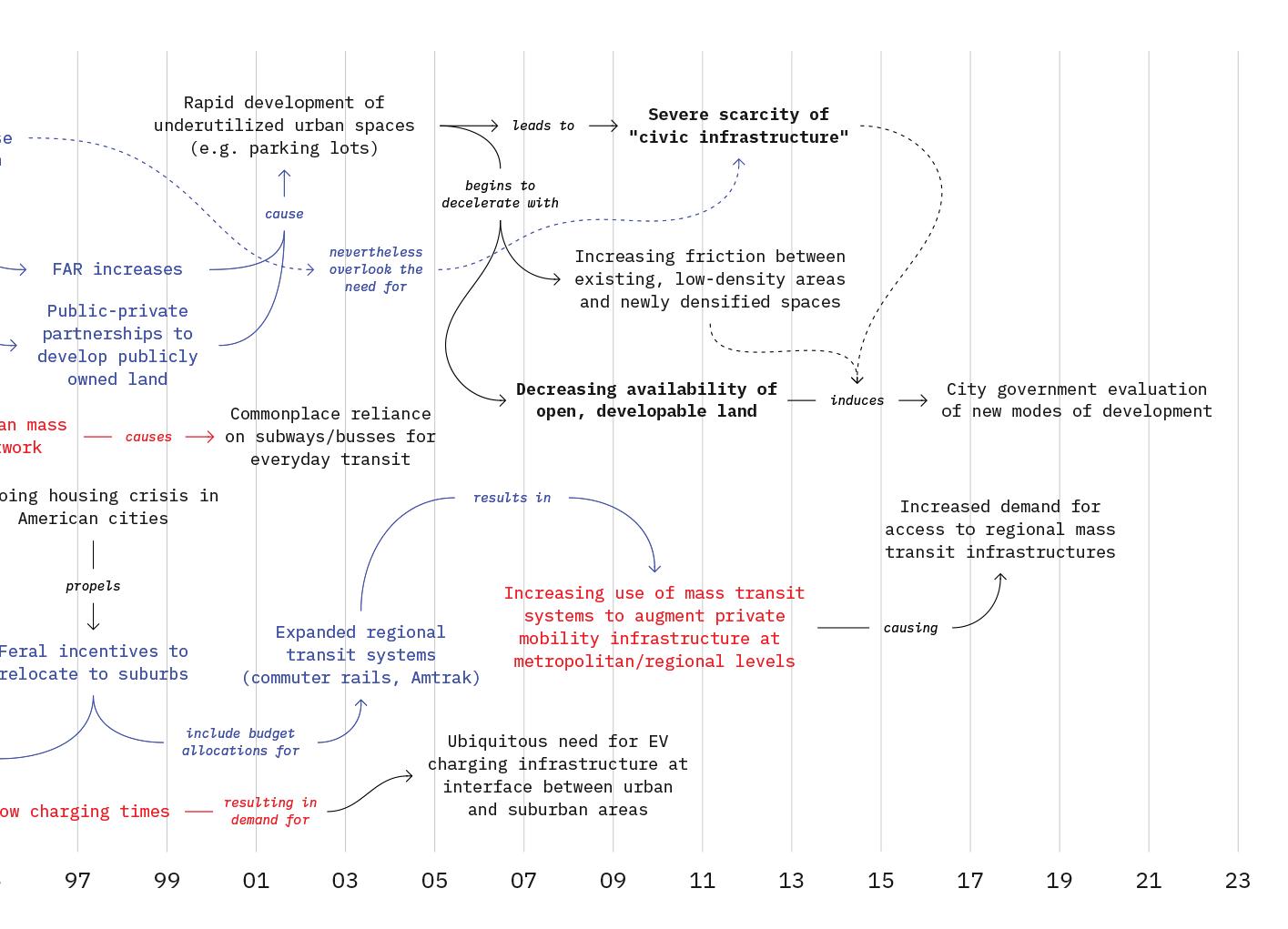 Imagined as a design exercise in its own right, the counterfactual game operated as a collective platform to lay bare the fragile and human decisions that drive the disposition of our urban systems and the architecture that serves them. The game yielded a 2024 site context shaped by slightly different decisions: a world of path dependencies and infrastructural relationships different from our own, and rich in their potential to enable design imagination.