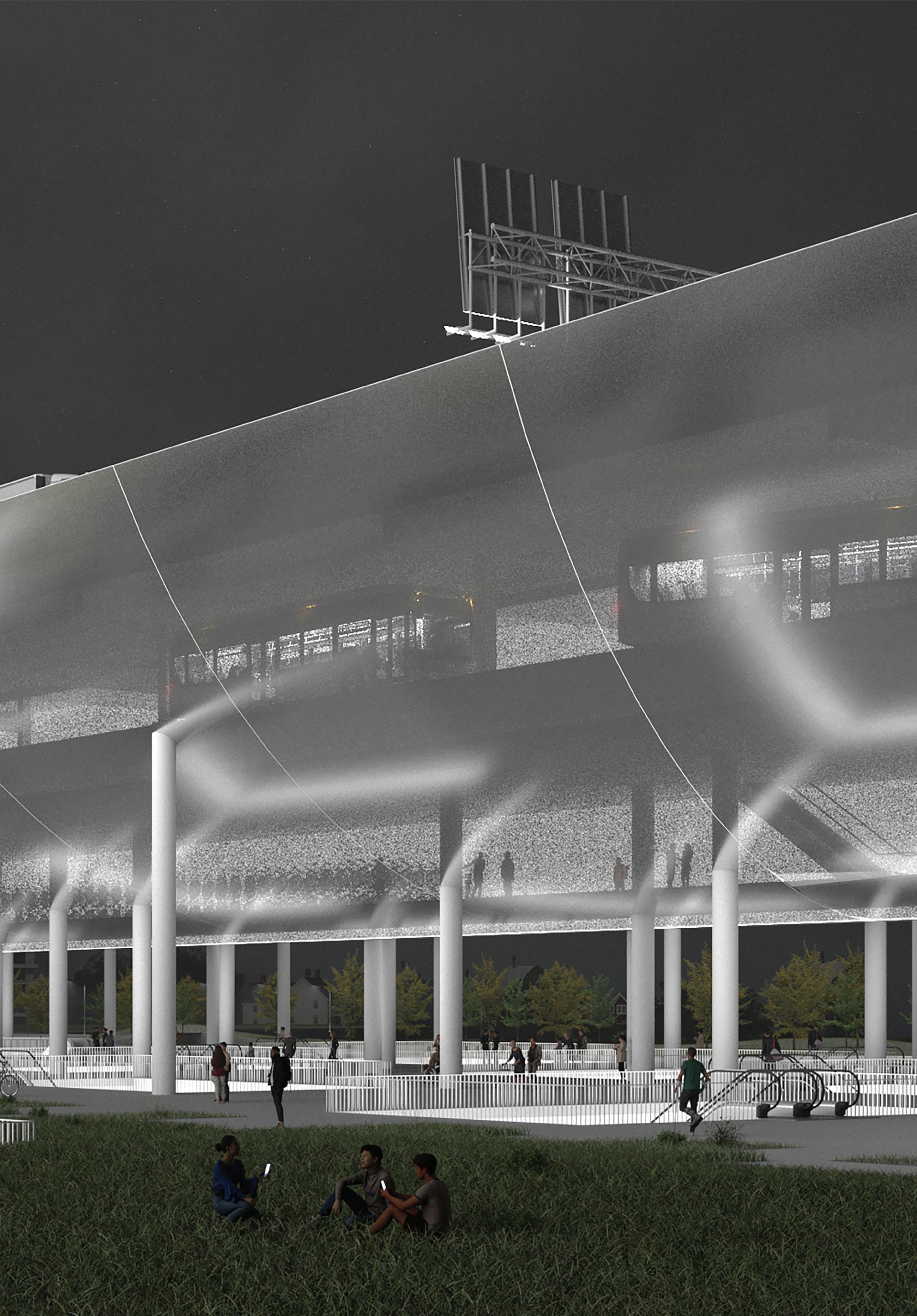 We theorize that in order for public space to be effective and active lies in the ability of infrastructure, transit in this case, to facilitate this interaction where the public spaces ingrained in transit must be accessible and inclusive. Additionally, infrastructural space, physical and digital, often prioritizes speed and efficiency, therefore, deliberate moments of friction and inefficiency are necessary to encourage engagement and reflection on a non-digital and interpersonal level. To explore this complexity, public space becomes a metaphorical stage that hosts unauthored and authored interactions between actors and produces a layered sensory effect supported by the architecture. The accessible ground stitches the neighborhood, formerly divided by modernist planning practices, with a continuous plane allowing the mobility hub to re-establish the neighborhood connection through the site and capture the public with spatial affordances on the site. The ceiling conceals the busy highway infrastructure to produce a contrasting backdrop that heightens the drama felt within the transit hub.