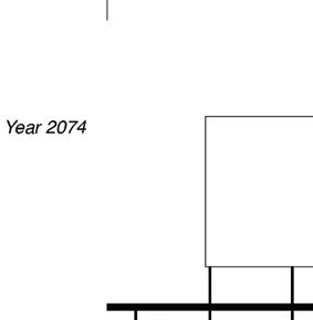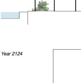 At right: Urban sections showing the end state of the surrounding elevated urbanism and mobility in 2124.