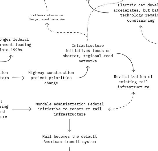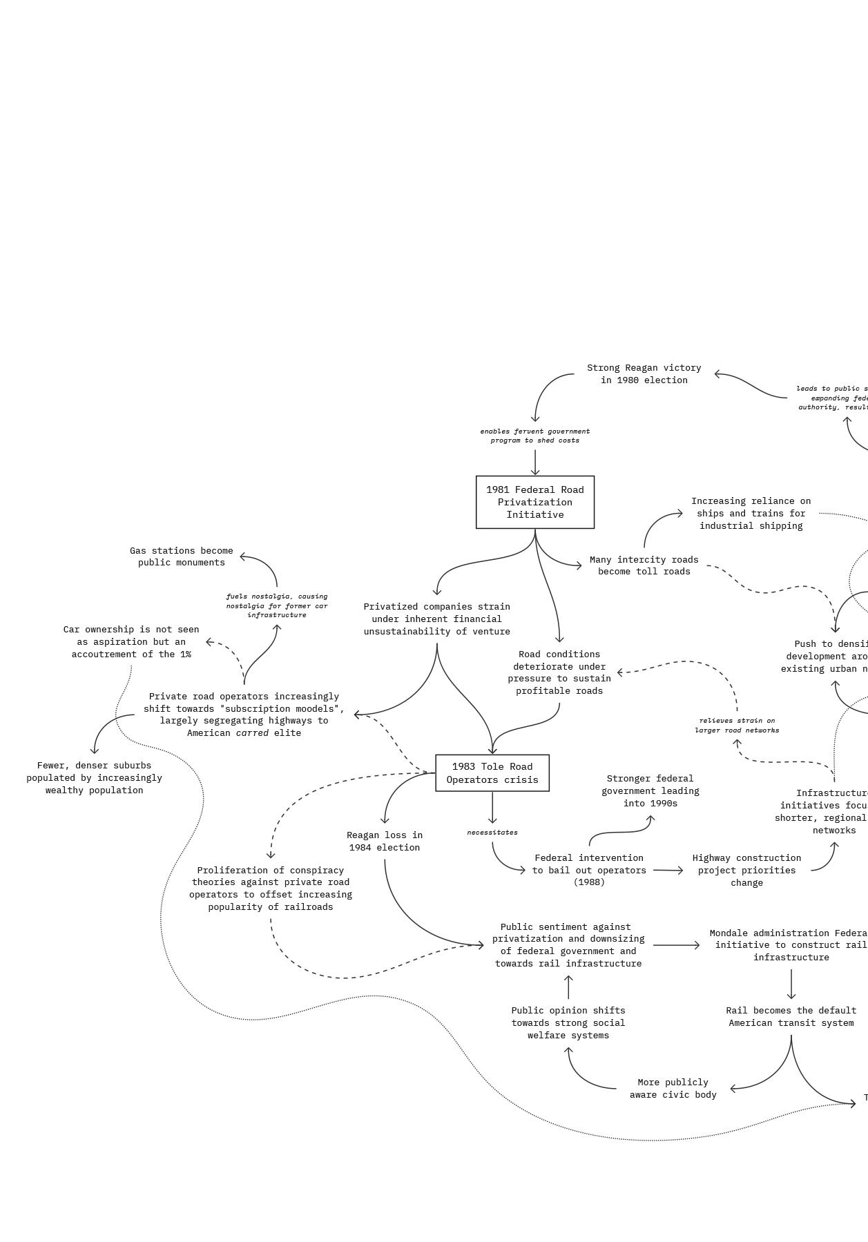 Studio participants arrived at the counterfactual game workshop with knowledge of the counterfactual prompt and having done individual research on the circumstances of policy and culture that informed essential decisions and contingencies that led to our present condition of carbon-dependant mobility. Once gathered together, and with the leadership of Tyler and Siqi and the input of experience transportation planners and designers, the students constructed counterfactual conditions for their site.