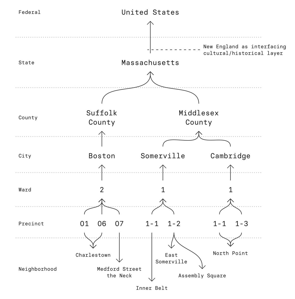 Above: Analysis of governing bodies demonstrating levels at which contingent decisions are made as they trickle down or push up between the federal and local levels, ultimately shaping the capacity of the architectural site.
