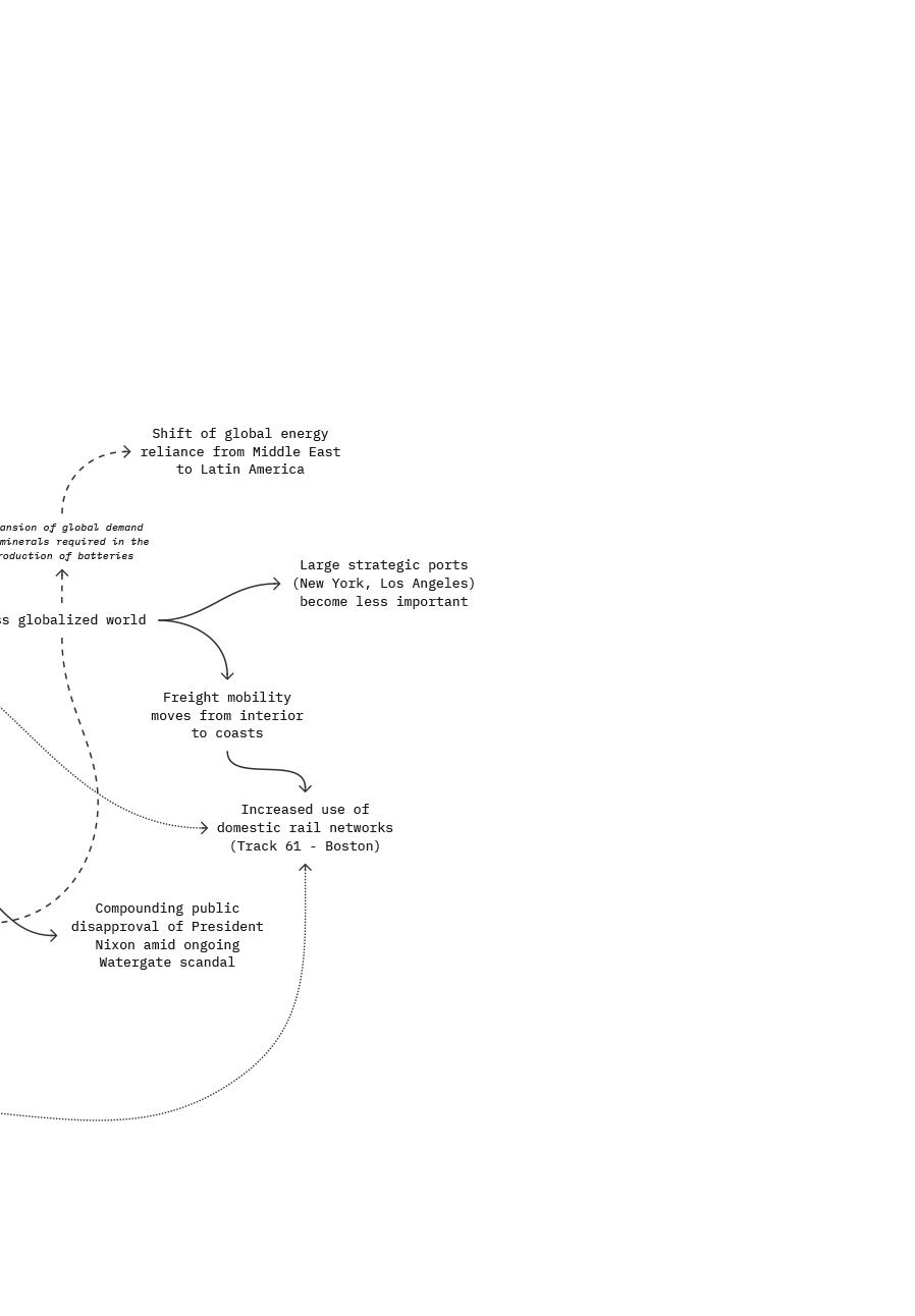 But what if the 1974 negotiations with OPEC failed? Would our patterns of development and urban form in the US have changed? To what extent would our transportation infrastructure and transit-oriented development be altered from their current form? And more specifically, what would a mobility hub on our sites in Boston contain? What systems and landscapes would it serve, and in what proportions? What fixed infrastructure would it contend with? Who would own and manage such infrastructure, and to what extent would mobility hubs operate as civic spaces? And what and who would move through them?
