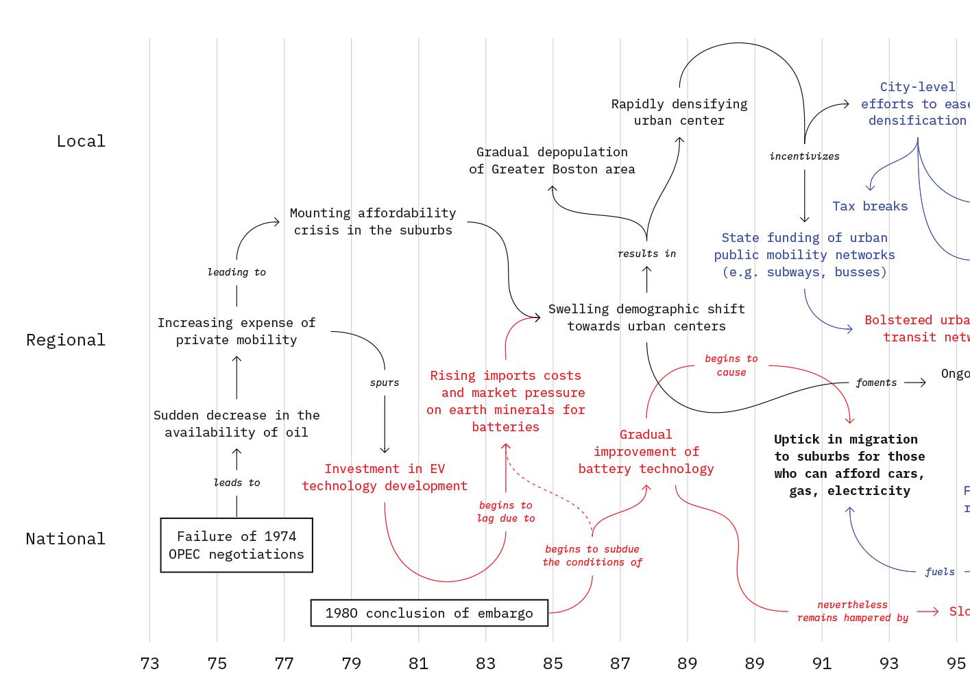What if the 1974 OPEC negotiations failed, developing into a longer-lasting embargo? How would the disposition of urban infrastructure in Boston, MA have evolved differently in a condition of forced decarbonization?