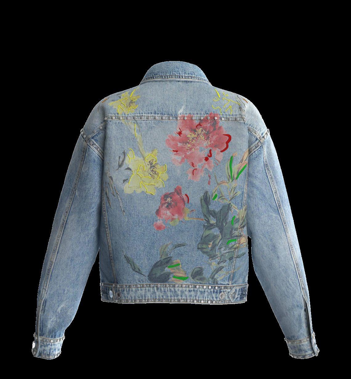 A four-color flower print with a hand-painted-effect on the leg adds a soft and appealing touch of femininity to these highly-wearable, premium eco-friendly jeans. Meanwhile, a matching jacket in sustainable indigo dye with classic jeans stich accents and gold-tone studs and a pure white version with silver-tone studs complete this must-have seasonal look.