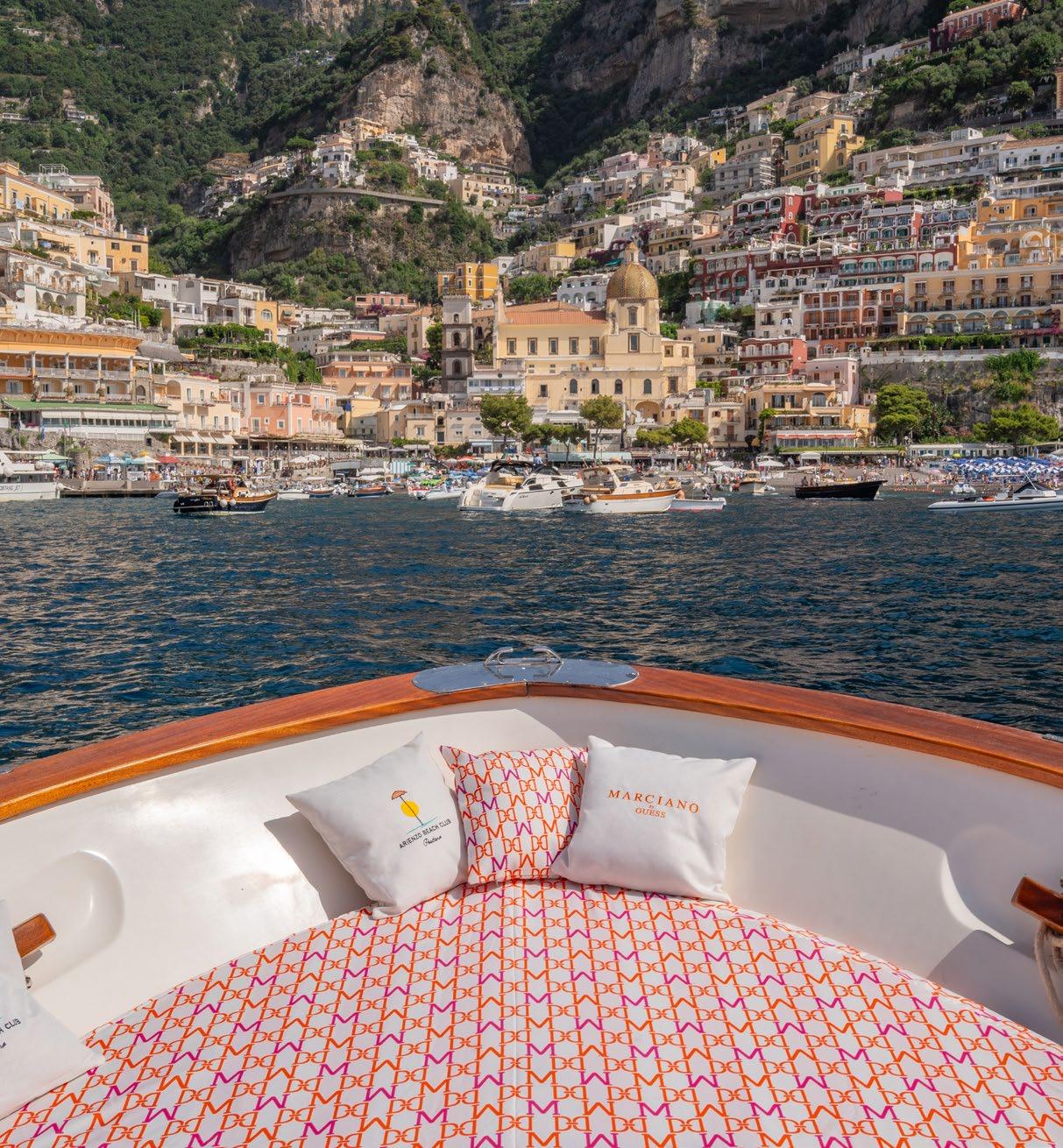 Every year, crowds of eager tourists flock here for the region’s exquisite Italian cuisine, with ingredients sourced from the surrounding area and nearby fishing villages, its majestic cliffs, breathtaking views, and unforgettable summer adventures. Here, the Marciano brand’s most iconic logo accent from the clothing collection appeared on loungers, towels, pillows and accessories, adding a summery, sophisticated finish to the club’s decor.