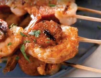 4. Heat grill or grill pan to medium. Add skewers and cook until shrimp is opaque and sausage is warmed through, about three minutes per side. Garnish with parsley and serve.