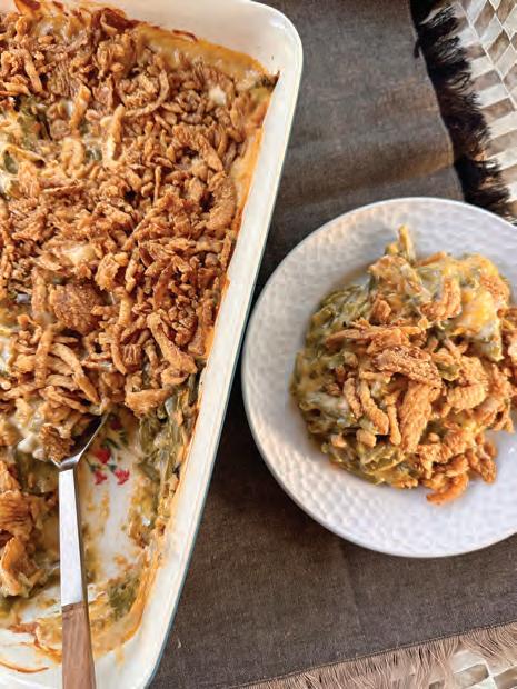 • Transfer mixture to a 9-by13-inch casserole dish. Bake at 375 degrees for 40 minutes uncovered. Add the French-fried onions for the last 10 minutes of cooking