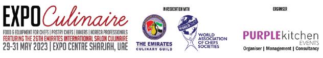 Food & equipment for chefs, pastry chefs, bakers, horeca professionals I Featuring the 26th Emirates international salon culinaire @expoculinaire info@purple-kitchen.com in association with ORGANISER Organiser | Management | Consultancy EXPOCulinaire 29-31 MaY 2023 | Expo Centre Sharjah, uae REGISTER TO EXHIBIT free visitor registration 2022 Post Show Report EXPOCulinaire is more than an exhibition it’s the Community HORECA WWW.EXPOCULINAIRE.COM