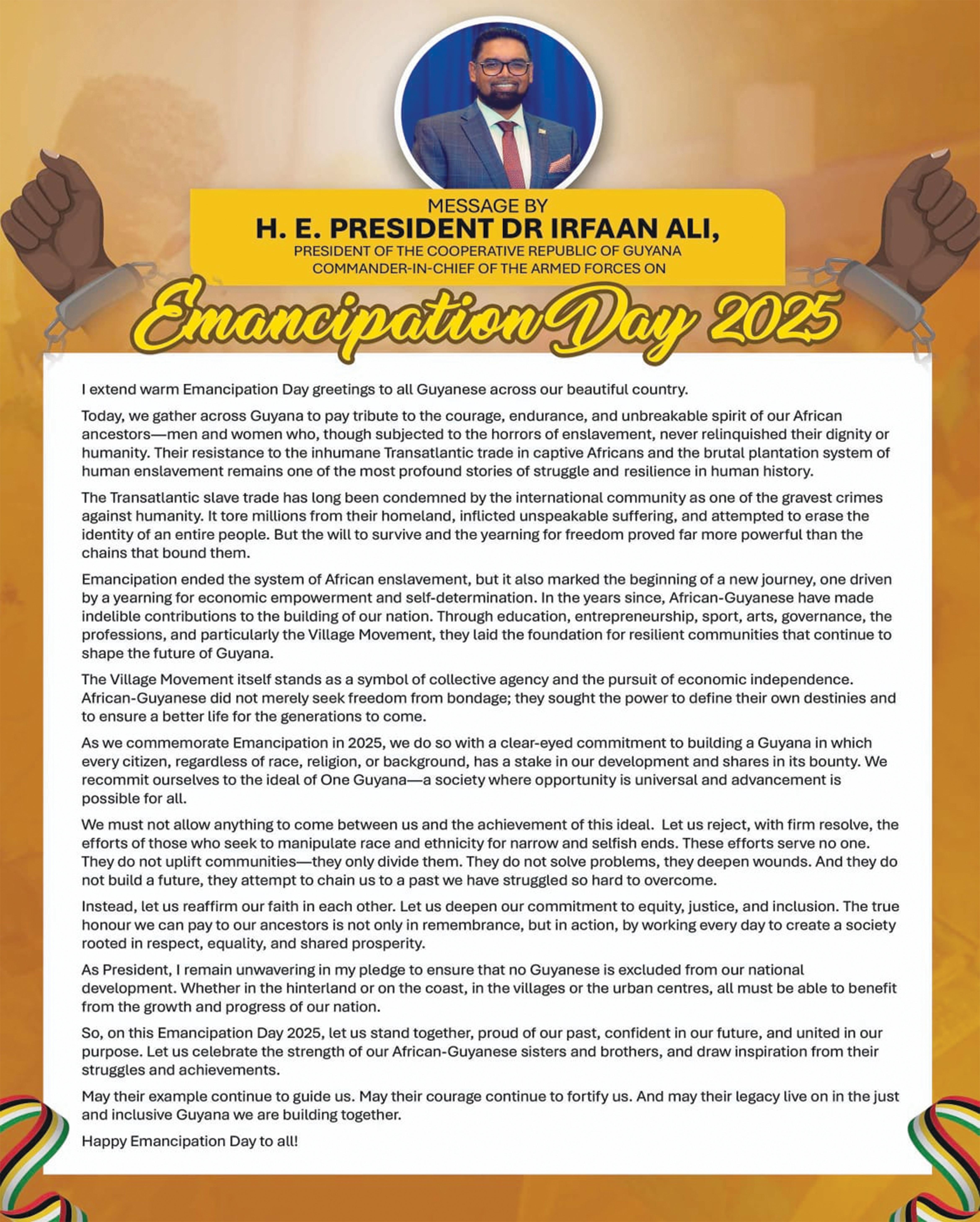 PRESIDENT Dr. Irfaan Ali has reaffirmed his government’s unwavering commitment to inclusive development, declaring in his 2025 Emancipation Day message that “no Guyanese is excluded from our national development.”