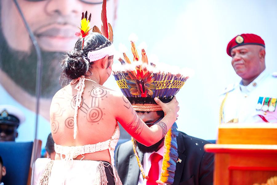 A Cacique’s Crown or what is commonly known as an Amerindian headdress is placed on President Ali’s head moments after he took the oath of office to officially mark the beginning of his second term as Guyana’s Head of State (Delano Williams photos)