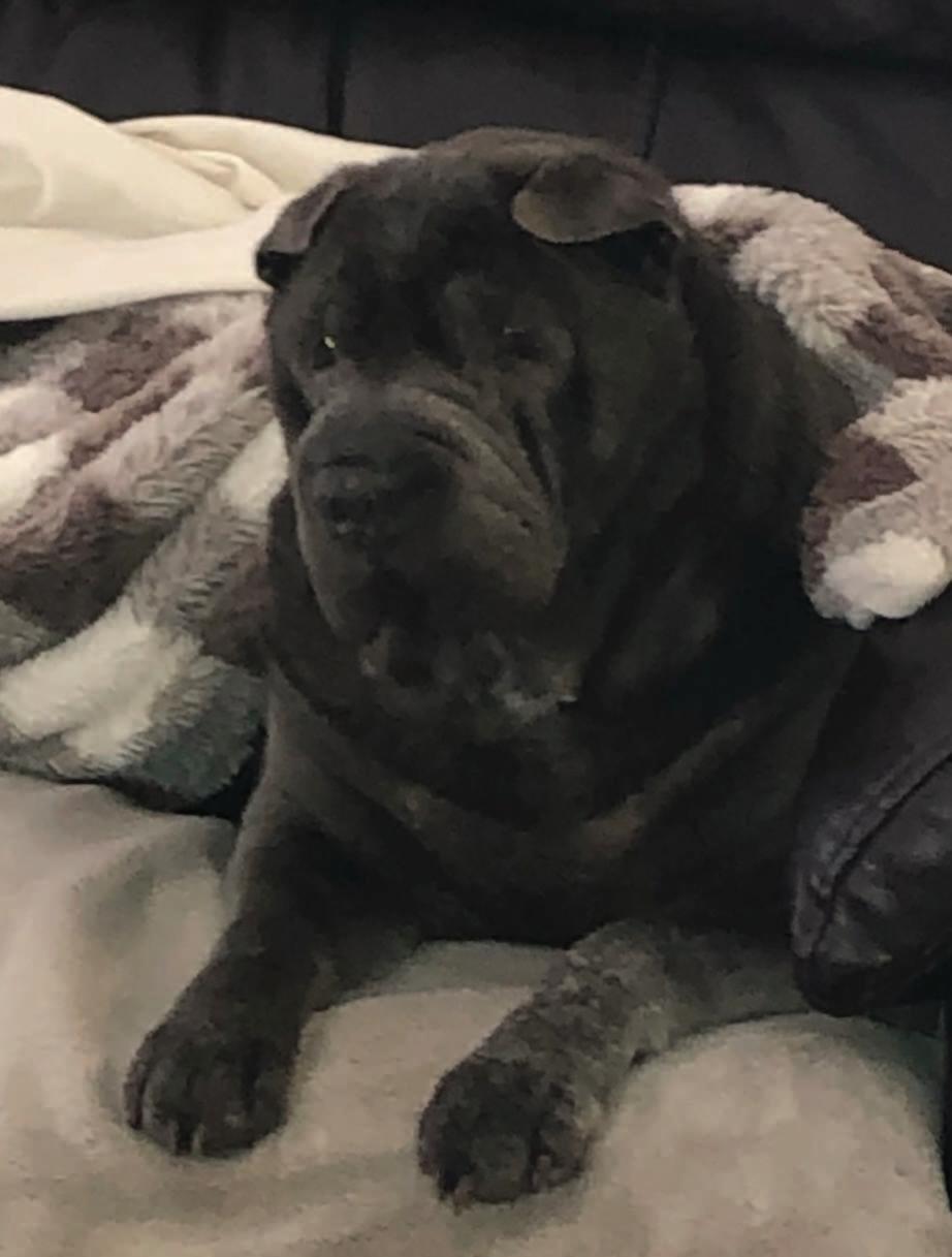 is a Chinese Shar Pei and is almost 16 years old! He loves sunning himself on the deck and has always had that “no care in the world“ attitude. He is an extremely friendly guy and is loved very much.