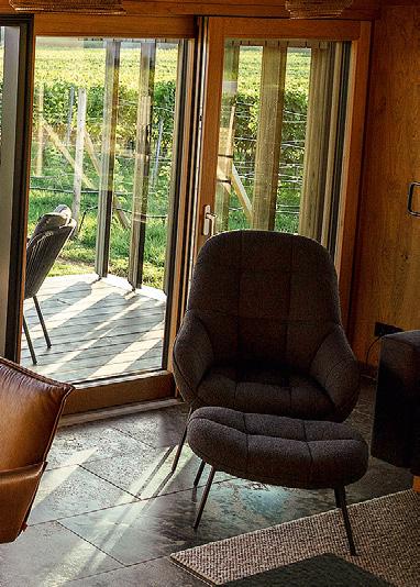 Innenräume sind geprägt von moderner Holzarchitektur, die Eleganz und Funktionalität vereint. Möbel von Walter Knoll und individuell gefertigte Schränke mit gelaserten Weinrebenmotiven sollen den Räumen eine luxuriöse und dennoch regionale Note verleihen. Besonders durchdacht ist der zentrale Weinklimaschrank in den Küchen, der den Gästen die Möglichkeit bietet, die Weine direkt vor Ort stilgerecht zu genießen. Eingelassene Kochfelder sorgen für ein klares und reduziertes Design. Ein weiteres Merkmal der Chalets sind die privaten Terrassen mit Hot Tubs, die für jeden Aufenthalt individuell mit frischem Wasser befüllt und durchgehend beheizt werden. Die Schwingfenster im Wohn- und Essbereich eröffnen einen ungestörten Blick auf die umliegenden Weinberge und sollen die Landschaft förmlich in den Raum fließen lassen. Diese Offenheit setzt sich im Schlafzimmer fort, wo das Bett zentral vor den großen Fenstern platziert ist, flankiert von getrennten Eingangs- und Ankleidebereichen, die Privatsphäre und Komfort kombinieren.