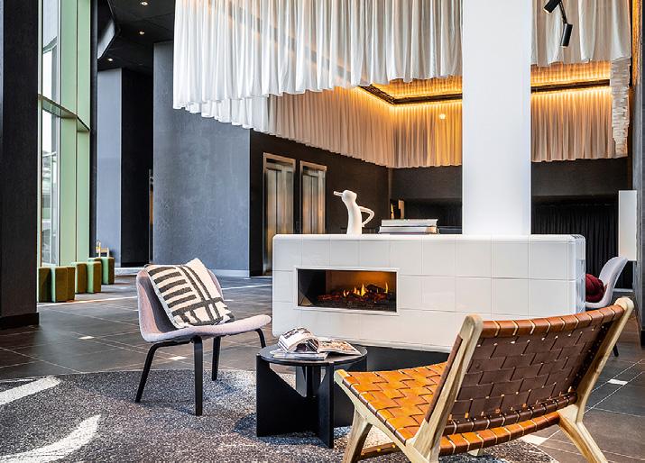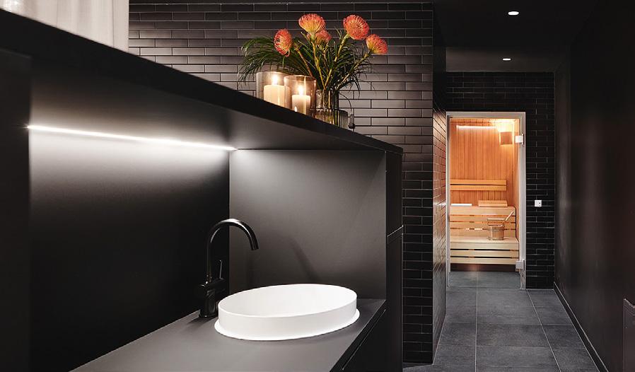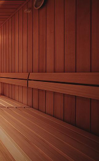 Ideen, die ihren Designstil prägen, in die Entwicklung dieser Sauna leidenschaftlich eingebracht“, so KlafsGeschäftsführer Phillip Rock. Feuer und Wasser. Heiß und kalt. Schwarz und weiß. Mit diesem Zusammenspiel wurde ein Raum geschaffen, in dem man nicht nur die spannende Dualität wiederfindet, sondern auch seine ganz eigene Balance. Der krönende Abschluss in Sachen Design und Holzhandwerk zugleich gebührt der Saunadecke mit dem eindrucksvollen 3DFischgrätmuster, das die Decke fast schon skulptural wirken lässt. Das Muster wird in Handarbeit in einem komplexen Prozess hergestellt. So erhält die Decke eine eigene Bedeutung: „Für mich war die Gestaltung der Decke besonders wichtig. So liegt man doch oft in der Sauna und schaut nach oben. Die wunderschöne Optik lädt nun zum Träumen ein“, erklärt Hansen. Dieses weitere Novum im Saunabau unterstreicht die Exklusivität ihres Konzepts. Auch die Wände nehmen das Fischgrätmuster auf. Die Designerin setzt zudem große Isolierglasfronten ein, die sich über die volle Breite und Höhe zweier Seitenwände erstrecken. Doch die Isolierglasfront beeindruckt nicht nur mit einem hohen Maß an optischer Weite, sondern sie ermöglicht auch, dass die Wärme länger in der Kabine gespeichert wird und der Wärmeverlust geringer ist. Das resultiert in einem verringerten Energieverbrauch.