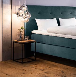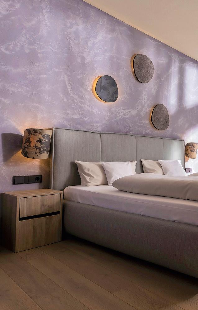 Überall in den Gästezimmern und Suiten wurden viele authentische Materialien, insbesondere verschiedene Holzarten, kombiniert – ohne dass es unruhig wird. Es kamen die heimischen Hölzer Ulme, Ahorn, Esche und Weißtanne zum Einsatz. Alle Möbel stammen größtenteils von regionalen Anbietern, Schreinern und Tischlern. Spannend gestaltet sind in allen Wohnhäusern die Böden, die aus einer sogenannten Lehm-Milcheiweiß-Mischung bestehen. Sie sind mit Carnaubawachs schützend überzogen. Dieser „Lehmkasein“-Boden ist ein sehr langlebiger Bodenbelag, der aus einer
