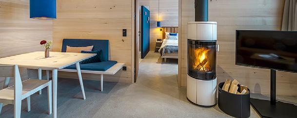 Der Wellnessbereich wurde behutsam in das Siedlungskonzept integriert. Das Spa-Badehaus passt sich mittig gut in die lockere Anordnung der Häuser ein. Im Untergeschoss gibt es eine finnische und eine Bio-Zirbensauna, ergänzt durch Dampfbad und zwei Behandlungsräume. Im Innern ruhig und passgenau: die Kombination von Ulme, Glas, Stein und Lehm. Speziell angefertigt wurde der Silberquarzitboden, der frost- und säurebeständig, antibakteriell, rutschfest und optisch ein Highlight ist. Dunkles Kanisfluhgestein an den Wänden und Möbel mit Korkfronten sorgen für eine wohltuende Raumwirkung. Fensterflächen in Superbreitbildformat laden zum Blick nach draußen ein und unterstützen die Aufforderung, sich zu entspannen. Ergänzend gibt es für Sportbegeisterte einen Fitnessraum mit modernen Ausdauergeräten. Ein besonderes Gebäude auf dem Gelände