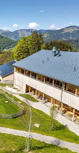 und sie folgt daher einer bestehenden Tradition. Mit dem „Lodge-Konzept“ Fuchsegg will sie die Natur greifbarer und erlebbarer machen, Geselligkeit und Treffen von Generationen ermöglichen und die Kulturlandschaft des Bregenzerwaldes vermitteln. Ludescher + Lutz Architekten aus Bregenz entwickelten ein Ensemble aus Gebäuden, das sich an den traditionellen Bauten der Region, den sogenannten Vorsäß-Hütten orientiert, aber auch den heutigen Anforderungen moderner Gebäude gerecht wird – und zudem ein durch und durch gästefreundliches Areal wurde. „Wir haben untersucht, welche Siedlungsformen in der