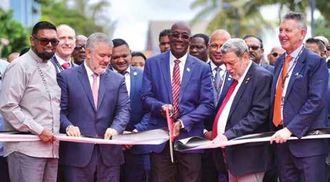 President Ali (at left) with other dignitaries at the International Energy Conference and Expo in Guyana. Cutting the ribbon is Trinidad and Tobago’s Prime Minister Dr. Keith Rowley and to his right is Dr. Ralph Gonsalves, Prime Minister of St. Vincent and the Grenadines.