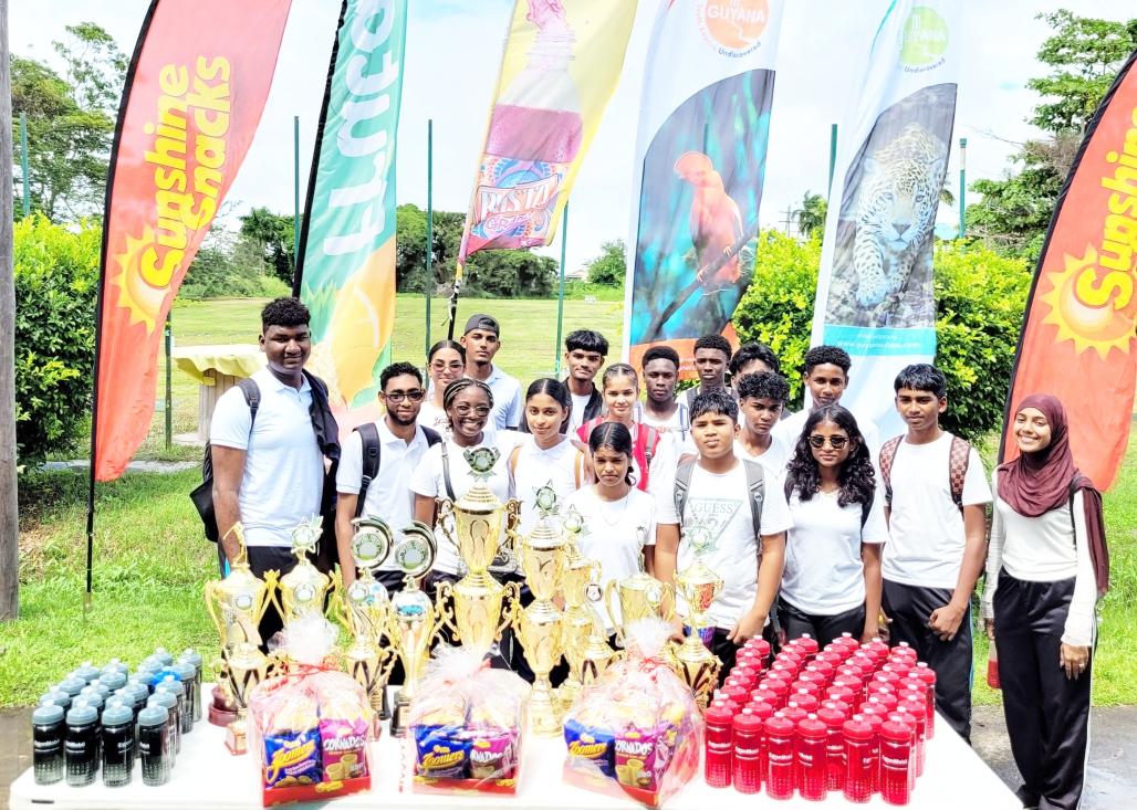 Region 5 REO Sadiek Ishmael presenting the winning trophy to the students of the Bush Lot Secondary School.