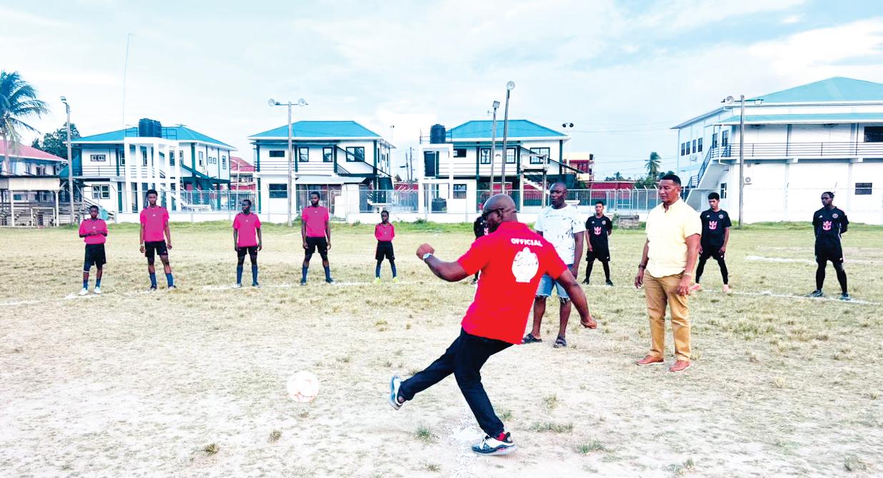 Assistant Director of Sport Franklin Wilson makes the ceremonial kick off of the tournament in the presence of officials including Chairman of the NSC Kashif Muhammad.