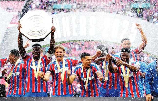 Crystal Palace’s Marc Guehi lifts the trophy as he celebrates with teammates after winning the FA Community Shield. (Reuters)