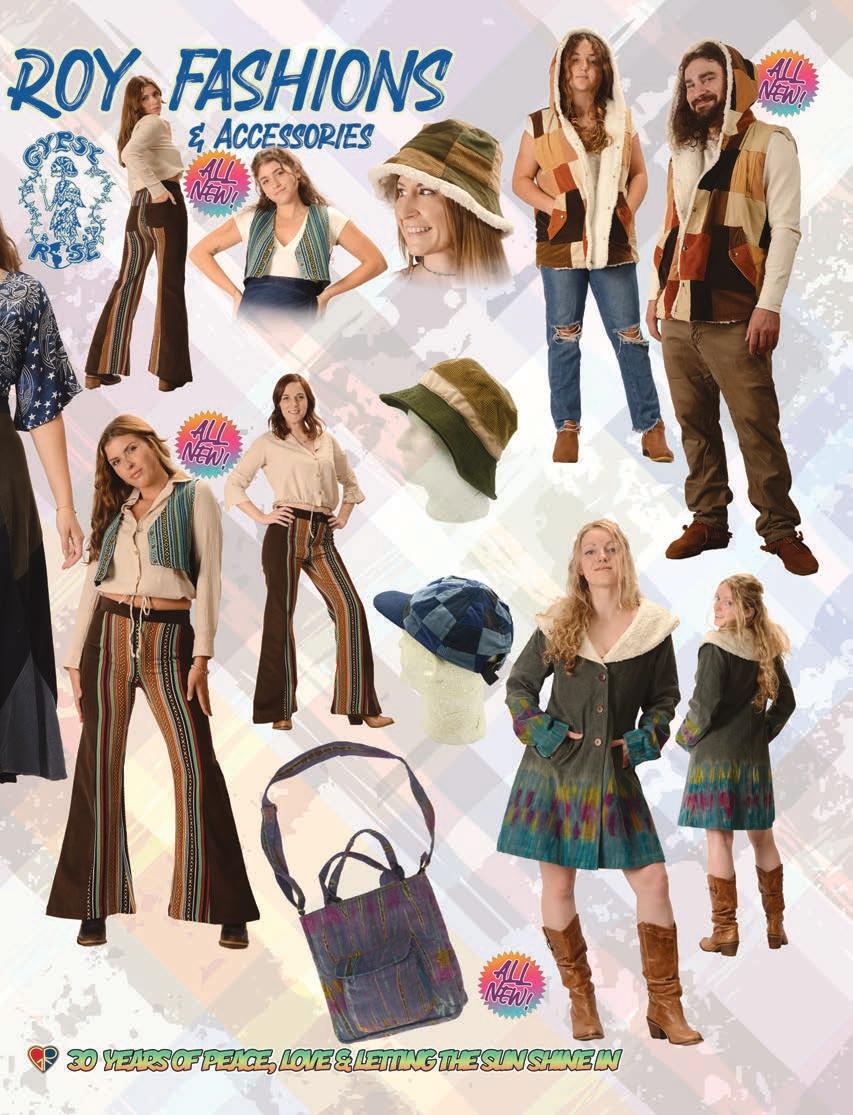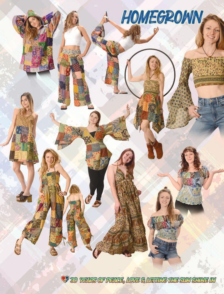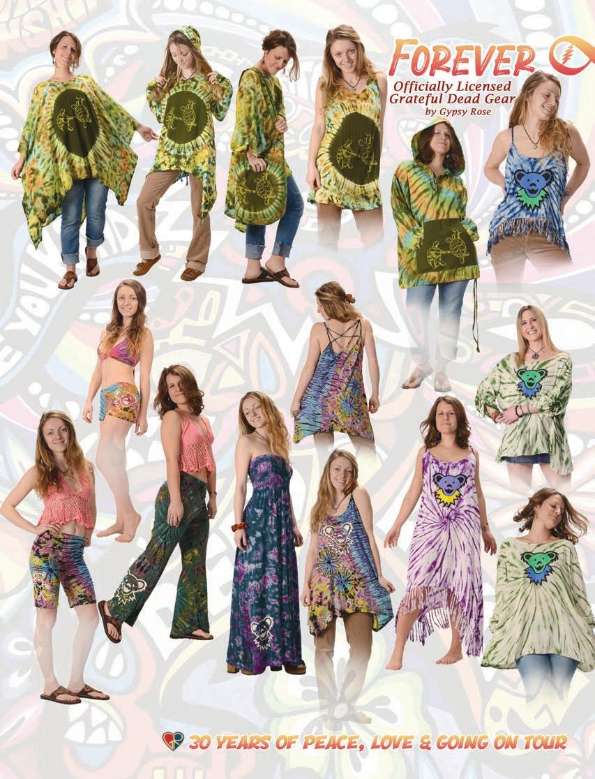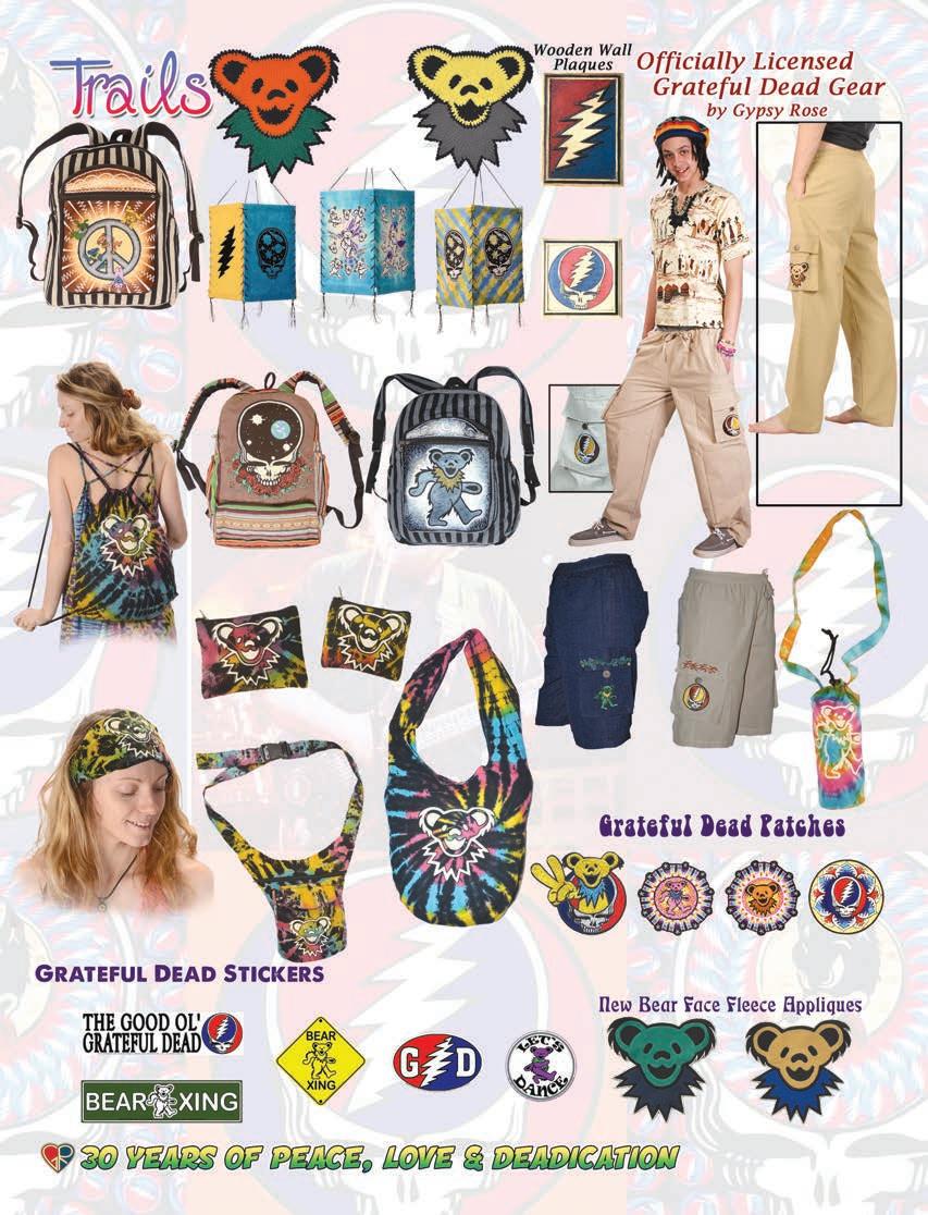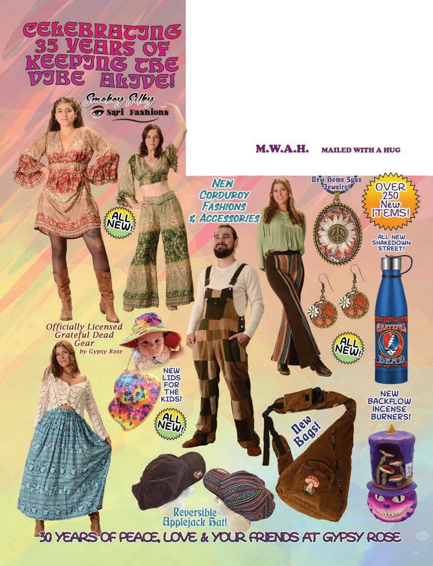 CLOTHING 2-6 New! Clothing & Accessories 7 Denim Digs 8 Velvet Finery 9 Cool Wool Gear 10-11 New! Outrageous Outwear 12-13 Homegrown Fashions 14-15 Mushroom Burst Prints Fashions 16-17 Rayon Silk & Sari Designs 18 Bu er y Prints 62-63 Love Light Zen Wear 64-65 Crochet Array 66 Screen Print Fashions GRATEFUL GIFTS 24-31 New! O cially Licensed Grateful Dead by Gypsy Rose 35 Fleece Throws 36-37 New! Grateful Gifts 40-41 New! Shakedown Street 42 New! Game Night ACCESSORIES 30-31 Hemp Gear 54-55 Socks, Socks, Socks 56 Bandana Madness 57 Hats/Lids for Your Head 58-59 Sarongs, Scarves & More 119-120 Cool Shades GIFTS 38-39 Kind Needs 121 New! Incense Burners 122-123 New! Incense & Oils 124-125 Incense Burners DECOR 48-51 Dorm Decor-Tapestries 52-53 Freak Flags 59-64 Nostalgic Rock Art -Posters Sepia & Ma ed Art Prints. BAGS 19 New! Cool Bags 20-21 Embroidered Bags 22 Travelin’ Bags 23 Groovy Bags JEWELRY 51 Chakra Jewelry 52-53 New! Home Spun Jewelry 54 New! Fashion Jewelry STICKERS 43 NEW! Stickers & Patches 44 Grateful Stickers 45 Hand Emb. Patches & Bu ons 46 Cool Stickers 47 Rock Stickers 48 Peace Stickers 49 Patches 50 Pin-It