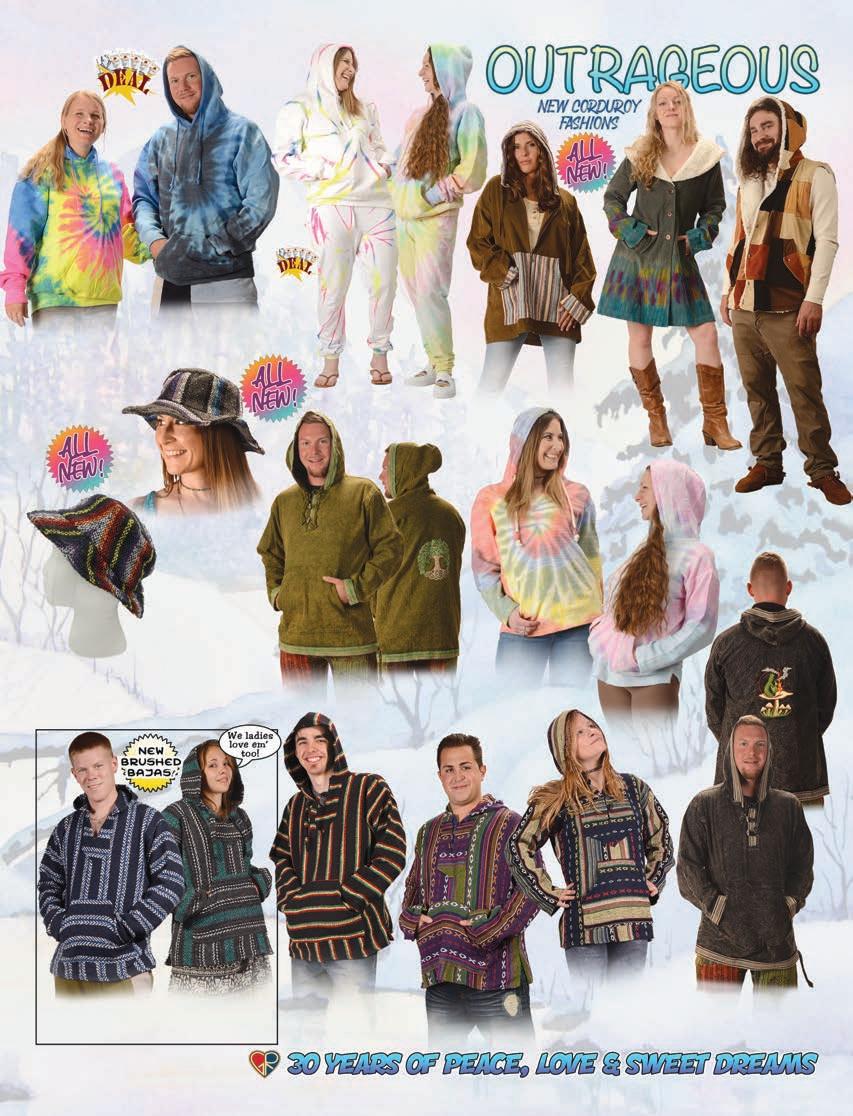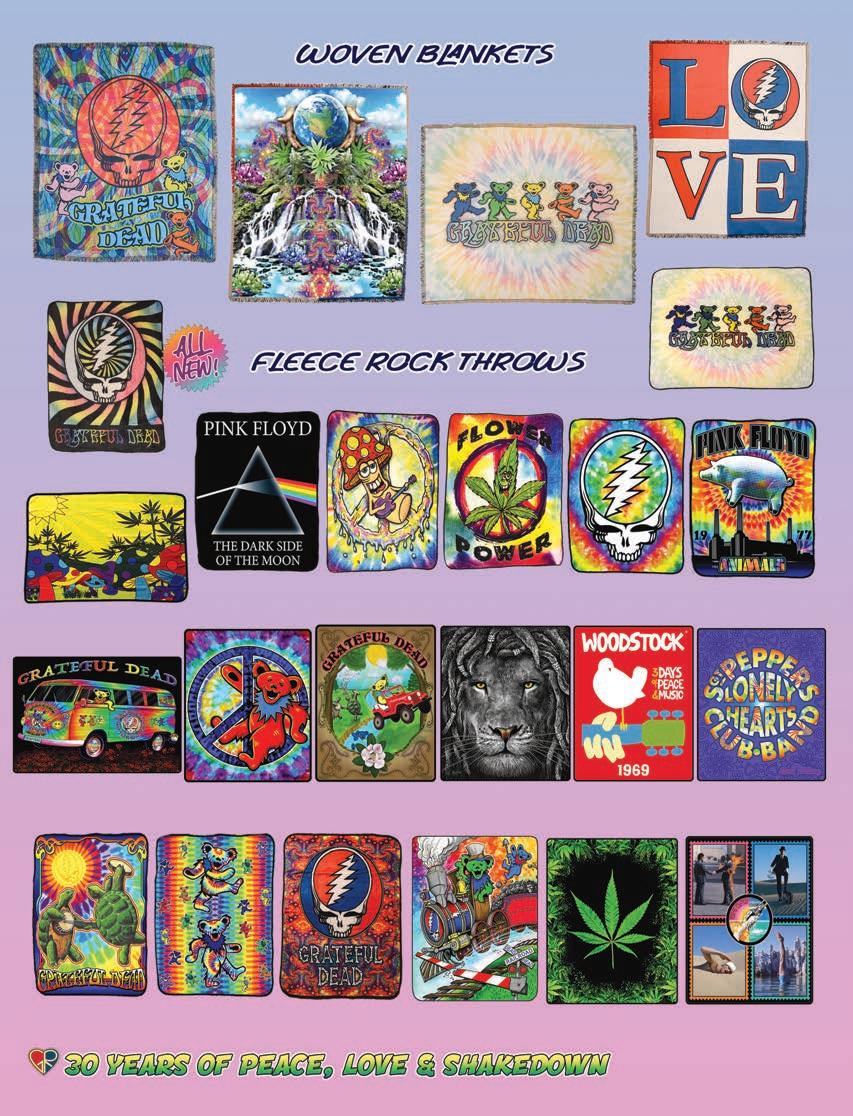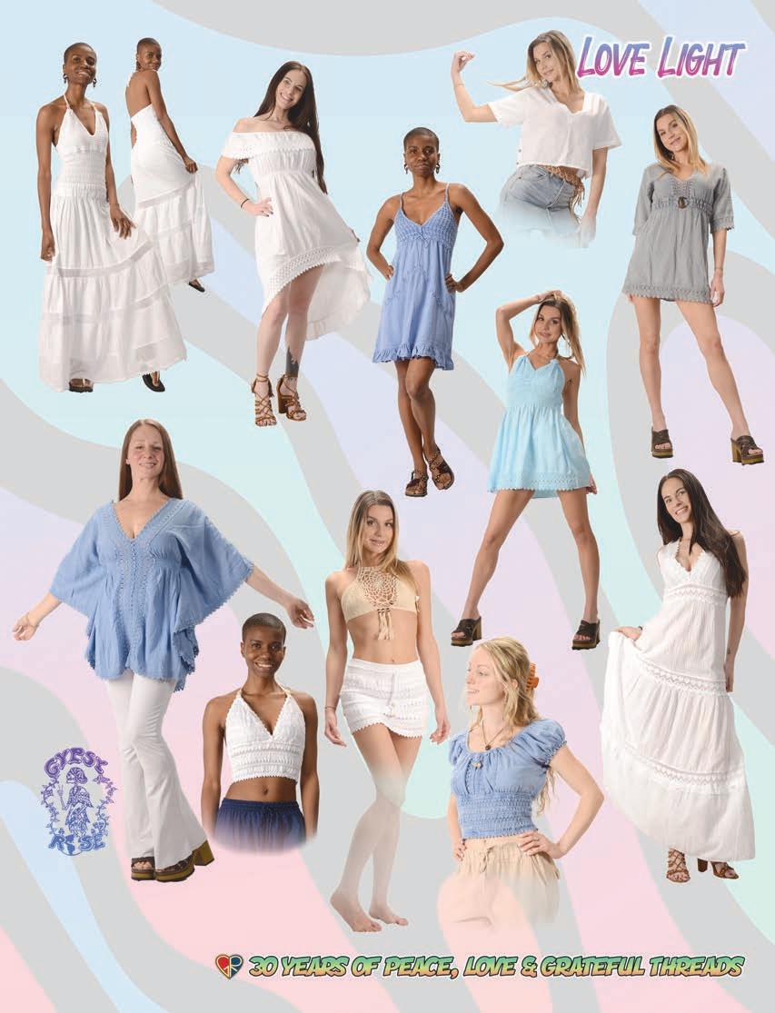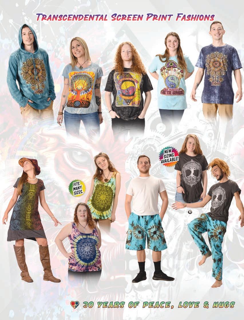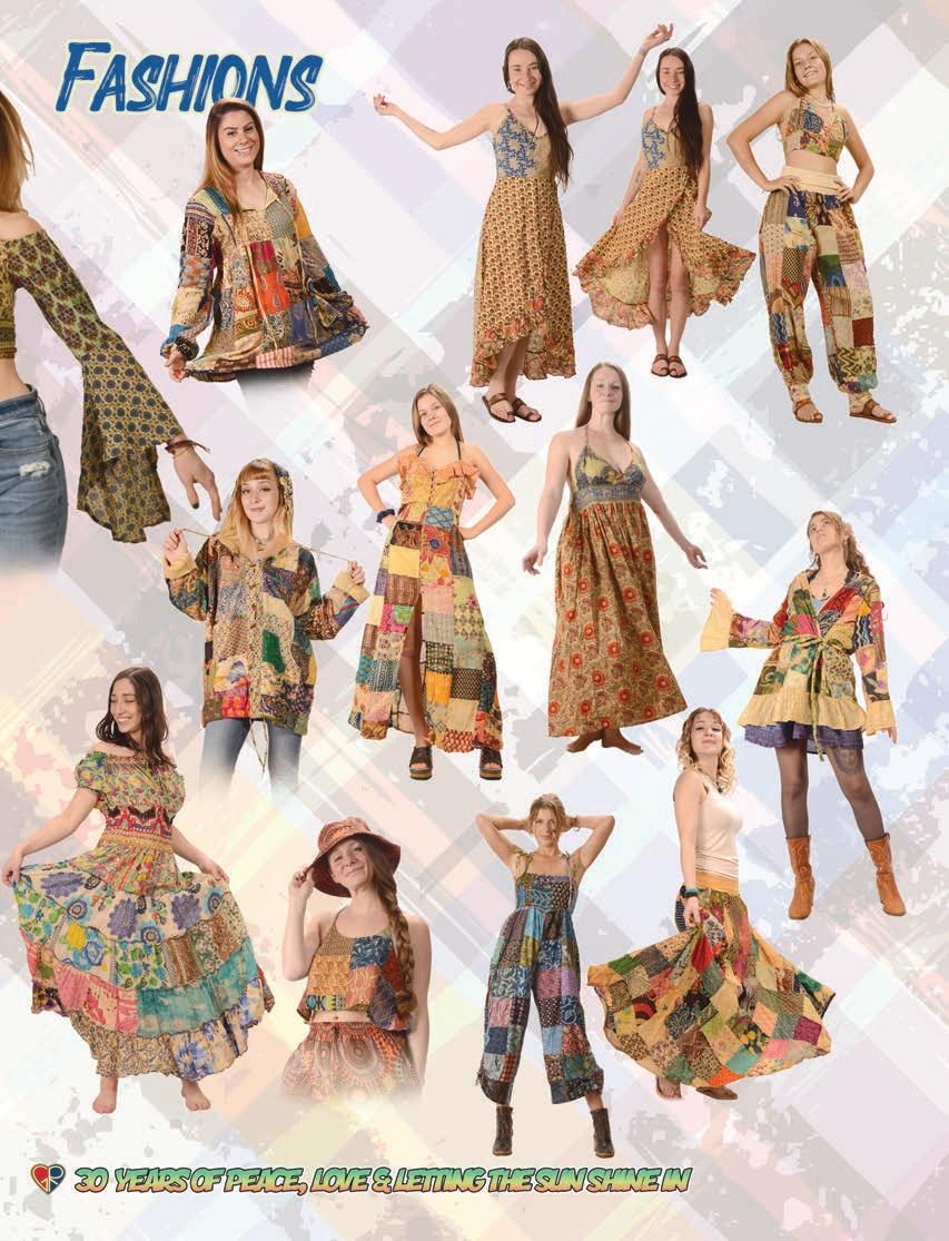 CLOTHING 2-6 New! Clothing & Accessories 7 Denim Digs 8 Velvet Finery 9 Cool Wool Gear 10-11 New! Outrageous Outwear 12-13 Homegrown Fashions 14-15 Mushroom Burst Prints Fashions 16-17 Rayon Silk & Sari Designs 18 Bu er y Prints 62-63 Love Light Zen Wear 64-65 Crochet Array 66 Screen Print Fashions GRATEFUL GIFTS 24-31 New! O cially Licensed Grateful Dead by Gypsy Rose 35 Fleece Throws 36-37 New! Grateful Gifts 40-41 New! Shakedown Street 42 New! Game Night ACCESSORIES 30-31 Hemp Gear 54-55 Socks, Socks, Socks 56 Bandana Madness 57 Hats/Lids for Your Head 58-59 Sarongs, Scarves & More 119-120 Cool Shades GIFTS 38-39 Kind Needs 121 New! Incense Burners 122-123 New! Incense & Oils 124-125 Incense Burners DECOR 48-51 Dorm Decor-Tapestries 52-53 Freak Flags 59-64 Nostalgic Rock Art -Posters Sepia & Ma ed Art Prints. BAGS 19 New! Cool Bags 20-21 Embroidered Bags 22 Travelin’ Bags 23 Groovy Bags JEWELRY 51 Chakra Jewelry 52-53 New! Home Spun Jewelry 54 New! Fashion Jewelry STICKERS 43 NEW! Stickers & Patches 44 Grateful Stickers 45 Hand Emb. Patches & Bu ons 46 Cool Stickers 47 Rock Stickers 48 Peace Stickers 49 Patches 50 Pin-It