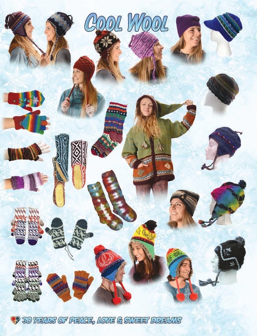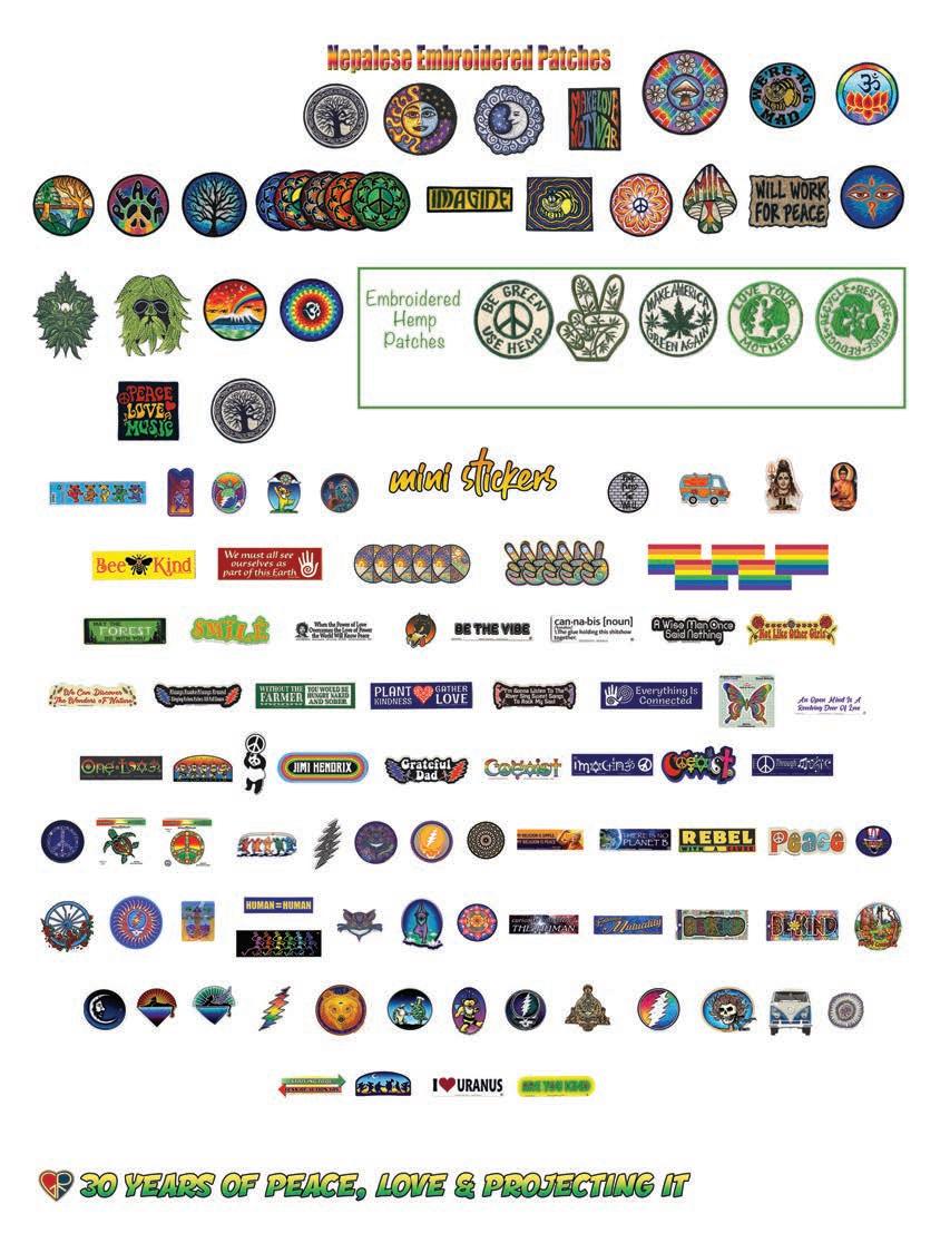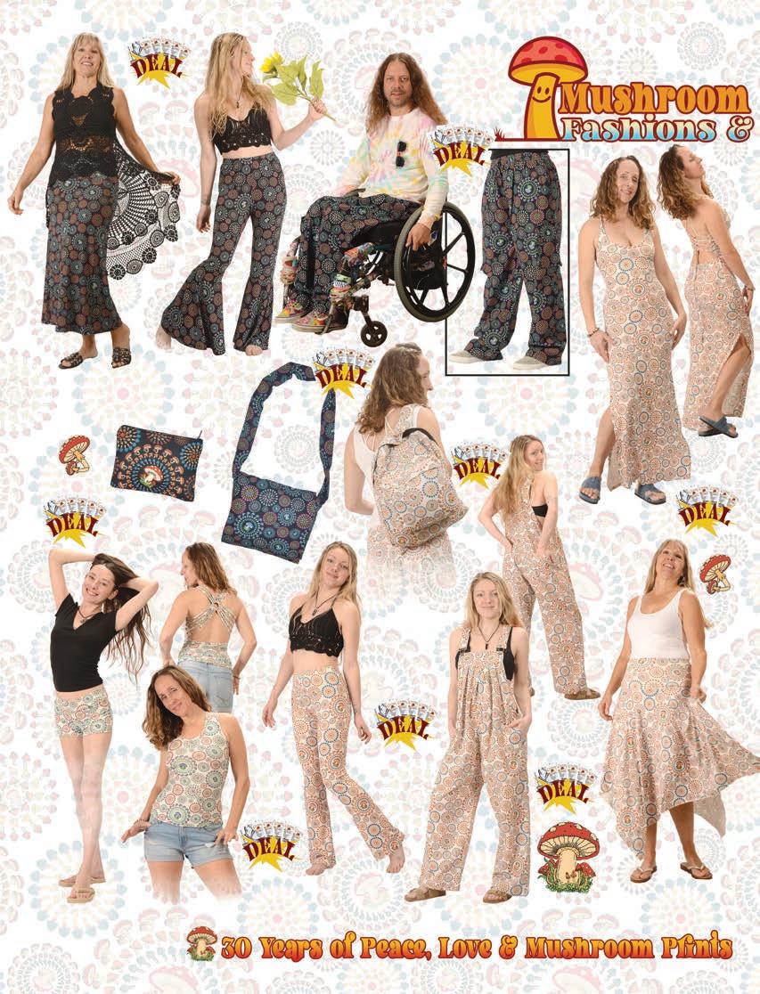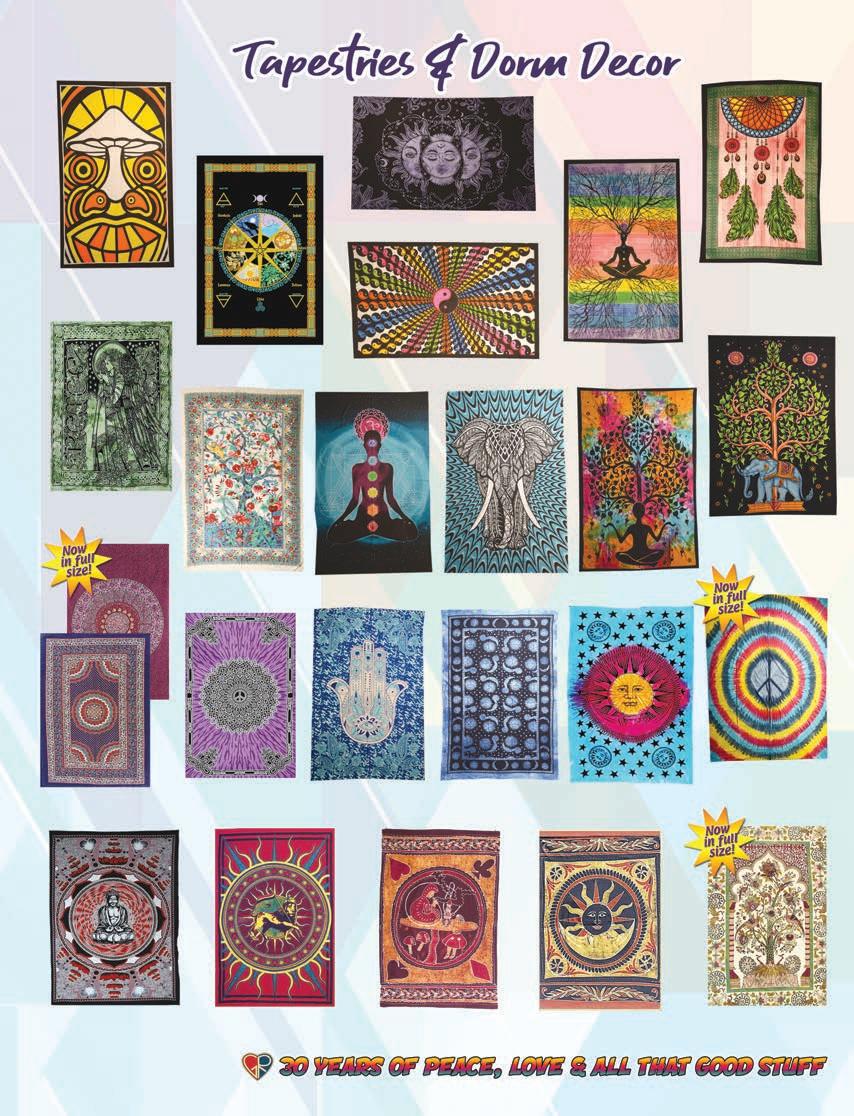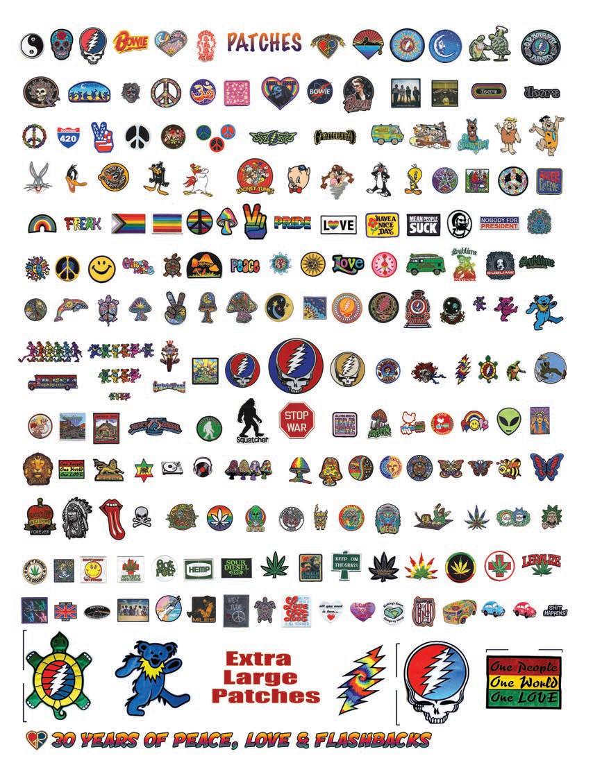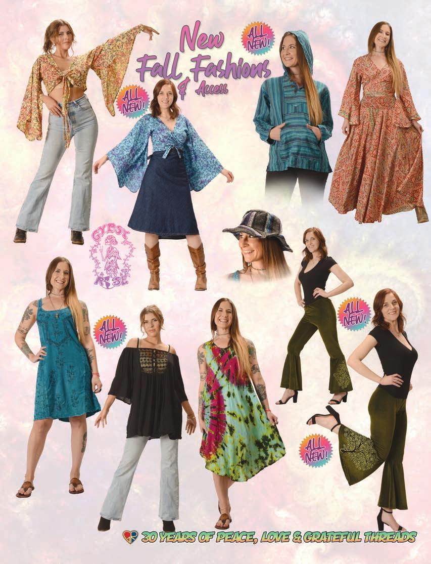 CLOTHING 2-6 New! Clothing & Accessories 7 Denim Digs 8 Velvet Finery 9 Cool Wool Gear 10-11 New! Outrageous Outwear 12-13 Homegrown Fashions 14-15 Mushroom Burst Prints Fashions 16-17 Rayon Silk & Sari Designs 18 Bu er y Prints 62-63 Love Light Zen Wear 64-65 Crochet Array 66 Screen Print Fashions GRATEFUL GIFTS 24-31 New! O cially Licensed Grateful Dead by Gypsy Rose 35 Fleece Throws 36-37 New! Grateful Gifts 40-41 New! Shakedown Street 42 New! Game Night ACCESSORIES 30-31 Hemp Gear 54-55 Socks, Socks, Socks 56 Bandana Madness 57 Hats/Lids for Your Head 58-59 Sarongs, Scarves & More 119-120 Cool Shades GIFTS 38-39 Kind Needs 121 New! Incense Burners 122-123 New! Incense & Oils 124-125 Incense Burners DECOR 48-51 Dorm Decor-Tapestries 52-53 Freak Flags 59-64 Nostalgic Rock Art -Posters Sepia & Ma ed Art Prints. BAGS 19 New! Cool Bags 20-21 Embroidered Bags 22 Travelin’ Bags 23 Groovy Bags JEWELRY 51 Chakra Jewelry 52-53 New! Home Spun Jewelry 54 New! Fashion Jewelry STICKERS 43 NEW! Stickers & Patches 44 Grateful Stickers 45 Hand Emb. Patches & Bu ons 46 Cool Stickers 47 Rock Stickers 48 Peace Stickers 49 Patches 50 Pin-It