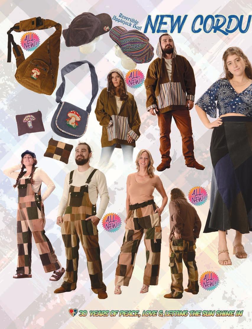 4 #64961 Corduroy and Gheri Reversable Applejack Hat w/ Mushroom Embroidery $22.95 CorduroyMushroom#64966Embroidered $34.95SlingBackpackApprox:12”X14” #64954 Mushroom EmbroideredGumdropCorduroyBag $29.95 Approx:11”X12” #64962 PatchworkCorduroyCoinPurse $7.95 Approx:5”X4” #64963 MushroomApplique CorduroyCoinPurse$6.95 Approx:5”X4” #64964 Corduroy and Gheri Zip Down Hoodie $49.95 Sizes: Large & X-Large #64964 Corduroy and Gheri Zip Down Hoodie $49.95 Sizes: Large & X-Large #64955 Patchwork Corduroy Overall $54.95 Sizes: Medium, Large & X-Large #64955 Patchwork Corduroy Overall $54.95 Sizes: Medium, Large & X-Large #64959 Patchwork Corduroy Cargo Pants $54.95 Sizes: Large & X-Large #64959 “Back Shot” Side & rear huge cargo pockets. TOP:611418 Celestial Print Crop Top $21.95 Free Size. SKIRT: #64957 Multi-Panel Corduroy Swirl Skirt $39.95 Sizes: S/M & L/XL