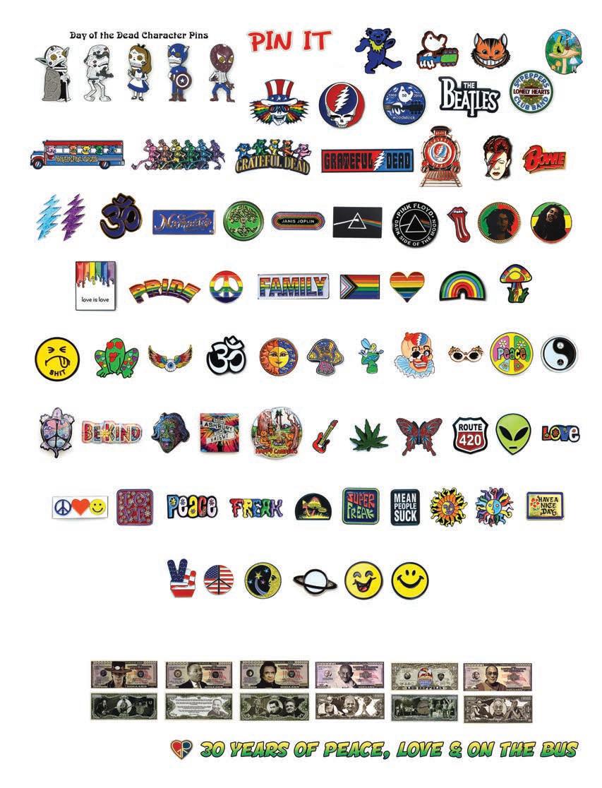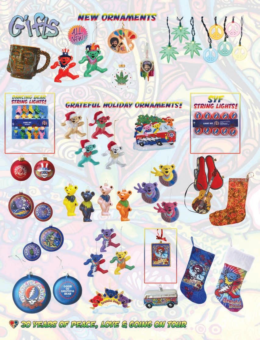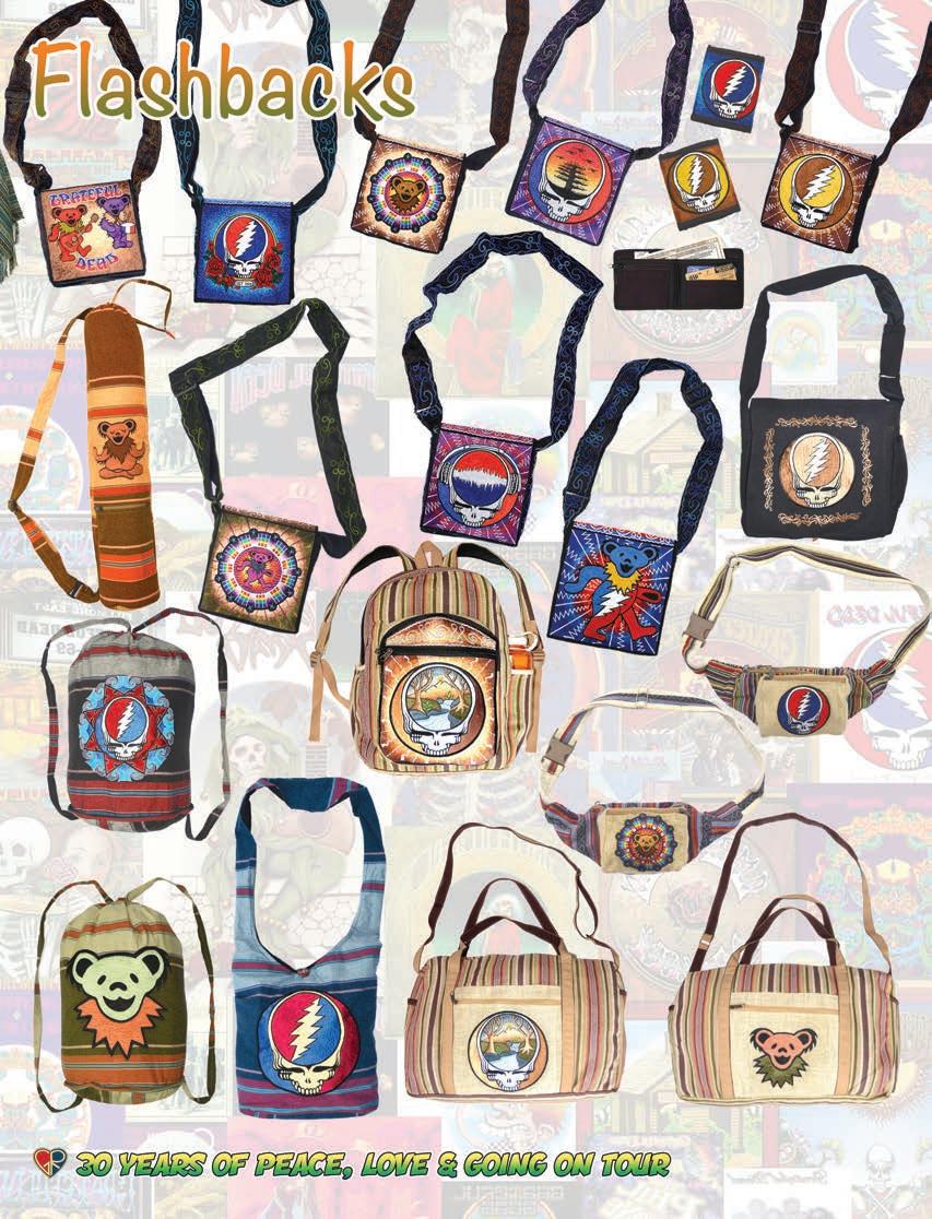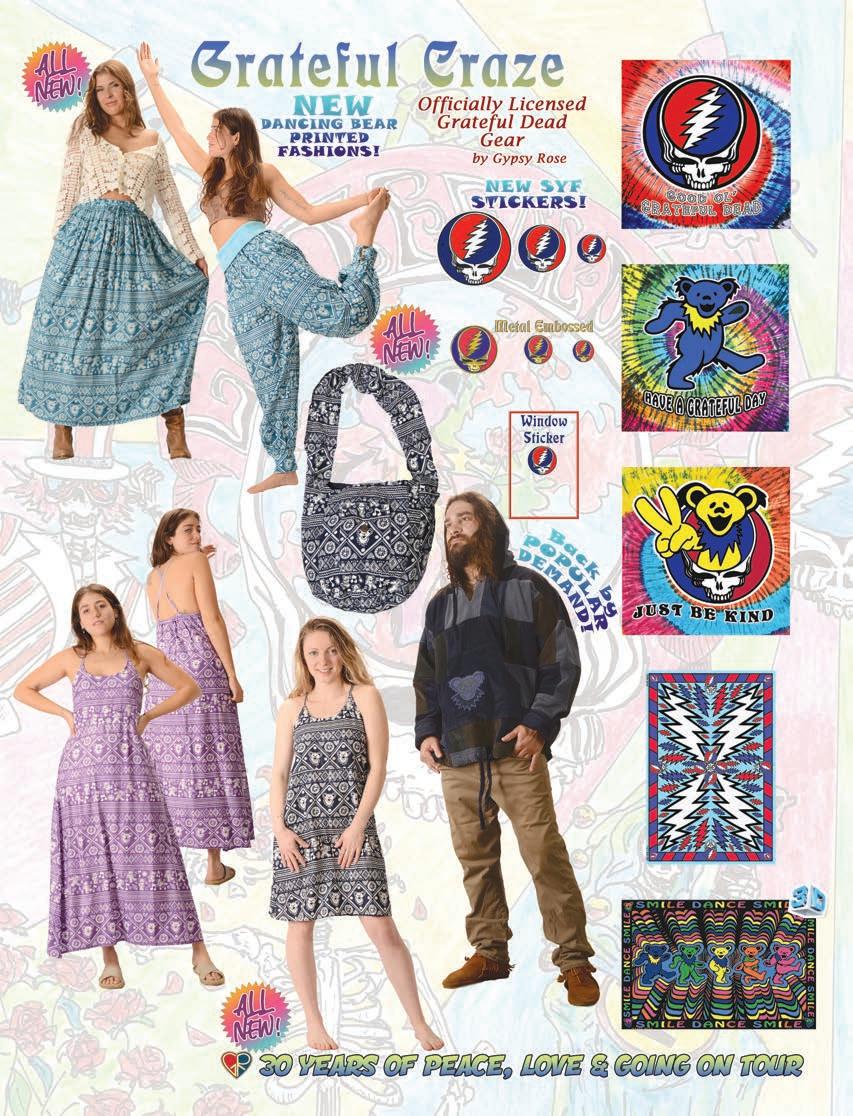 Gypsy Rose could not operate in the parking lots alone so we found a home forus on a peaceful farm in rural Bucks County, PA. We set up our “warehouse” in a red metal building that was once home to the farm’s pigs! Babies were born, presidents were elected and numerous Grateful Dead tours occurred.It wasn’t always easy when the majority of the Gypsy Rose work force wanted to take days off to hit their favorite venues onsummer tour but somehow we found the time to work & play. We saw the Dead “break out” songs they had not performed in years & at the same time embrace new technology & ideas as they trekked onward. Old & new, past & future, they moved in both directions much like us. And they shared our commitment to peace & environmental concerns. The Grateful Dead echoed in our products, the stories from their shows and of course on the radio in the barn. On a summer day in early August 1995 Gypsy Rose was busy packing up all of our goods in preparation to move into a new warehouse down the road. As we applied packing tape to the cardboard boxes we heard the song on the radio go silent that morning and the DJ cut in with some dark news. The Dead had lost their lead guitarist & singer Jerry Garcia. It hit us pre y hard but like the Dead whether we would survive but we got by. In fact we grew bigger than ever spreading the “word” all over the world as the 1990s rolled on. Our new home allowed us to reach all of you ina much easier & e cient way. Friends old and new came aboard to join us in our new digs. Our catalogs went from10-20 page pamphlet size booklets of black & white newsprint paper to the bright shiny full size issues we put out now. We watched the digital age grow as the internet became such a large part of everyone’s lives. We were shocked as the horrible news of September 11, 2001 unfolded. We listened intently to the details & updated for weeks fterward. As purveyors of peaceful products we were extremely saddened to know that something like that could happen in our world let alone our own country. And we did the only thing that we could do which was to continue to spread the message of peace, tolerance &environmental awareness. We saw our old friends from the Dead reunite in this new century & felt that old spark ll our hearts once again. Our country elected an African American president for the first time. The world’s and our own economy presented us with great challenges as the decade came to a close.