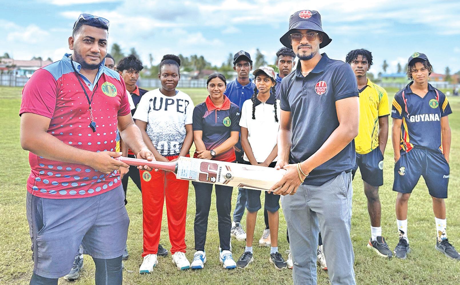 The CEO of Cricnation592 presents a bat to Coach Ameer Rahman with some of the youths at the academy
