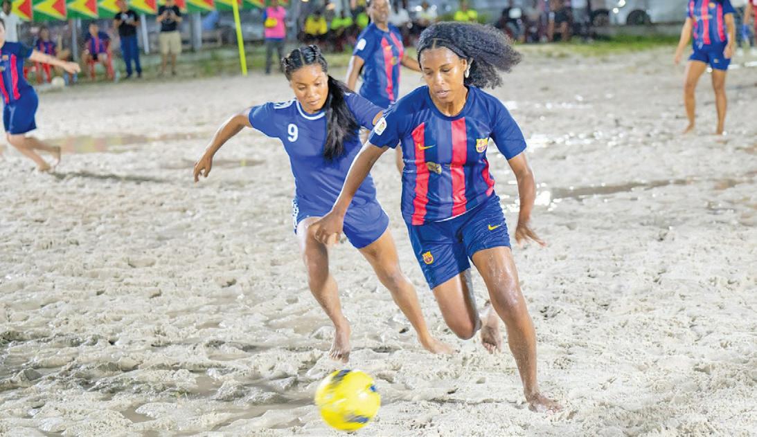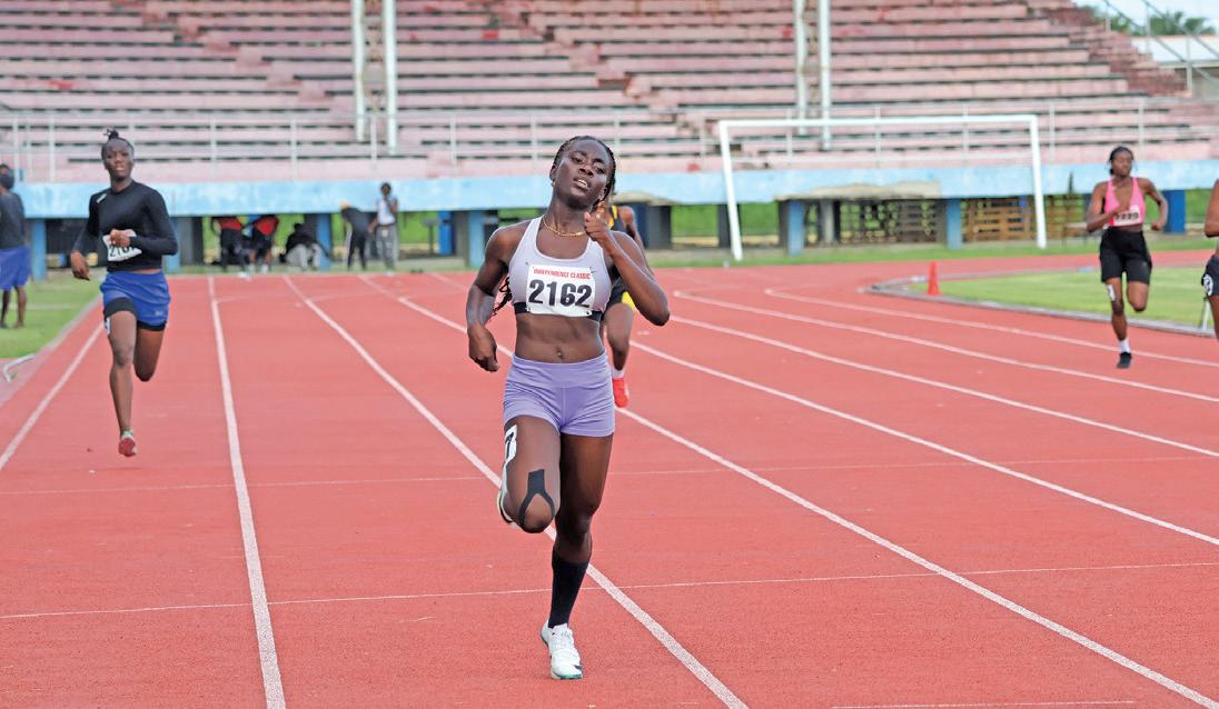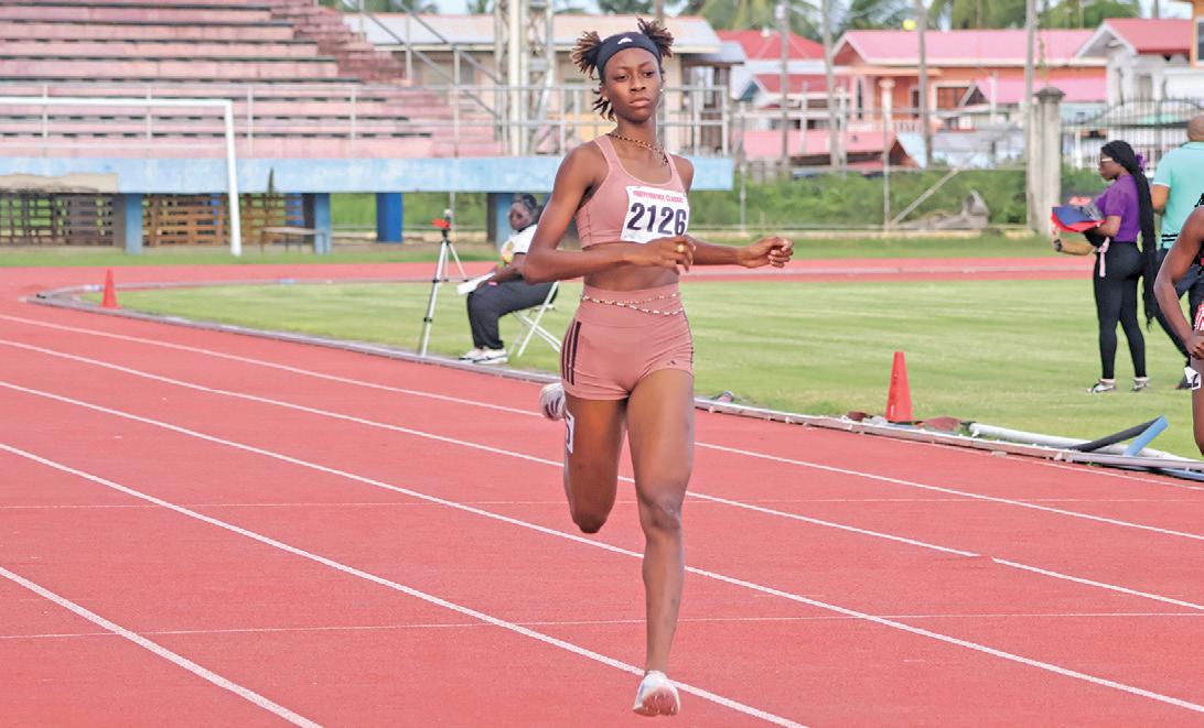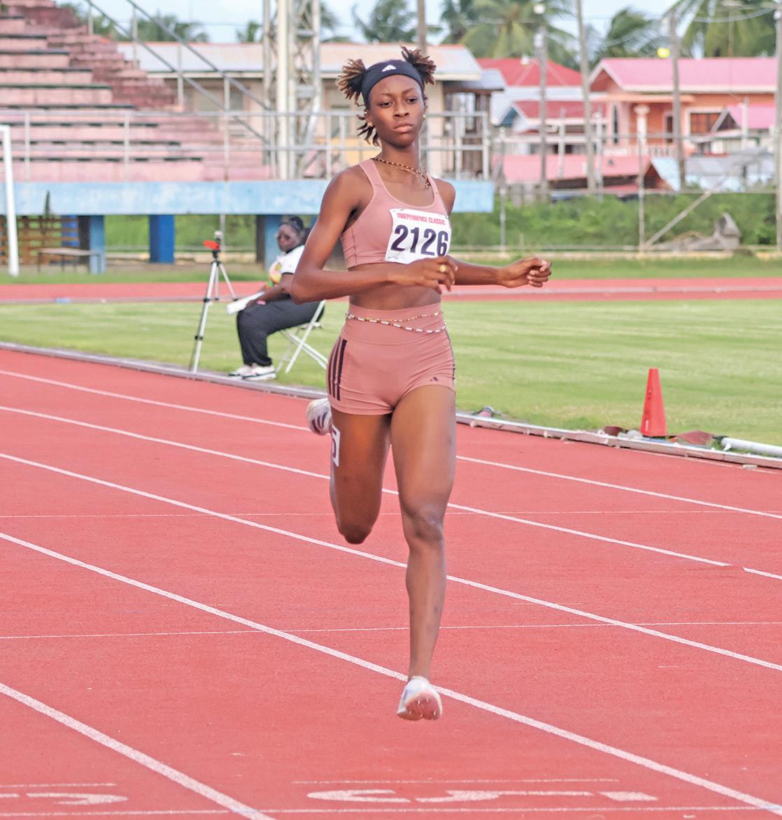 feat, the sprint double, in the Boys’ U17 events was Upper Demerara’s Deuquan Farrell. Farrell stopped the clock at 10.83s in the 100m and 22.16s in the 200m for two gold medals. In the 18 and over 100m race, Police Progressive Youth Club’s Cassie Small took the blue ribbon with 11.79s while Guyana Defence Force duo Savannah Adams and Tonya Rawlins clocked 11.95s and 12.13s respectively, to complete the podium.