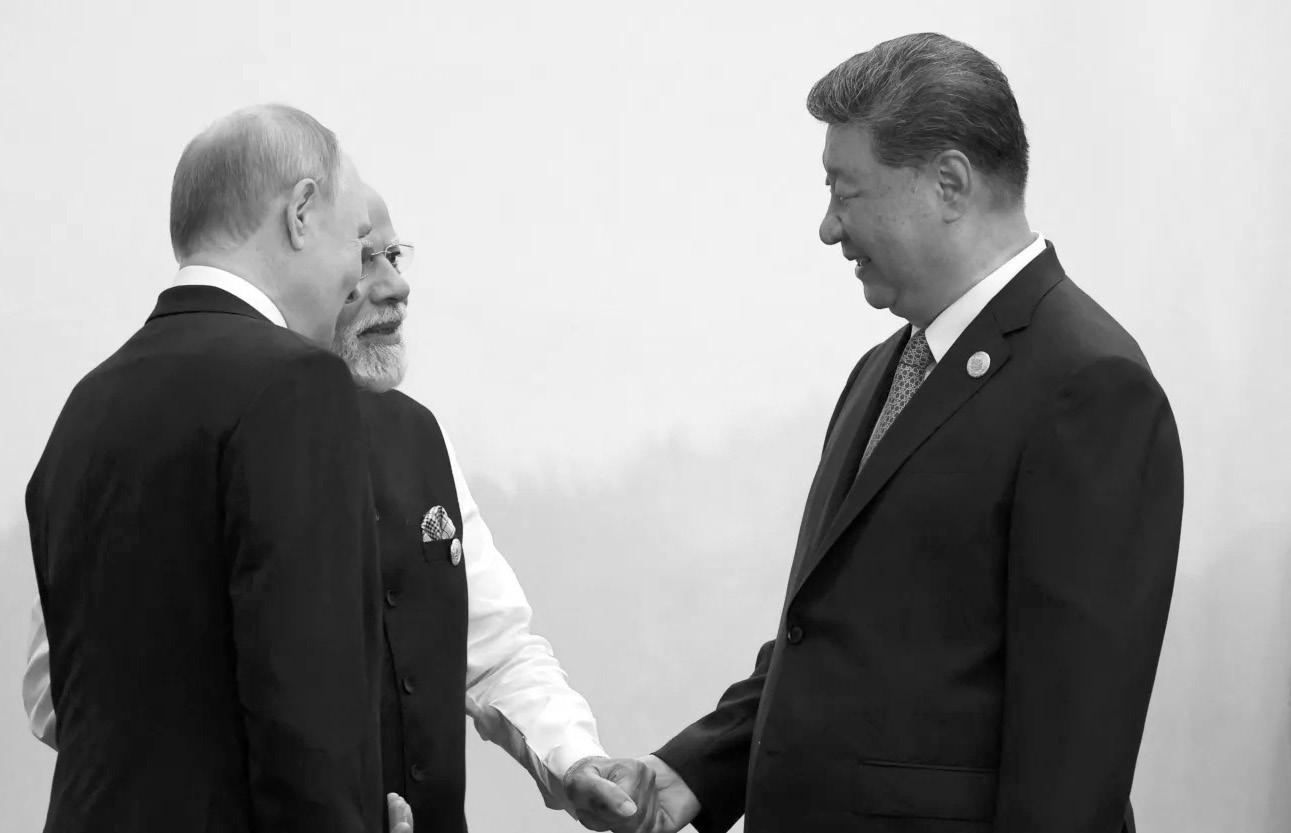 In an image designed to convey a mood of solidarity, Putin and Modi were shown holding hands as they walked jovially towards Xi before the summit opened. The three men stood shoulder-to-shoulder, laughing and surrounded by interpreters. (Excerpt from Reuters)
