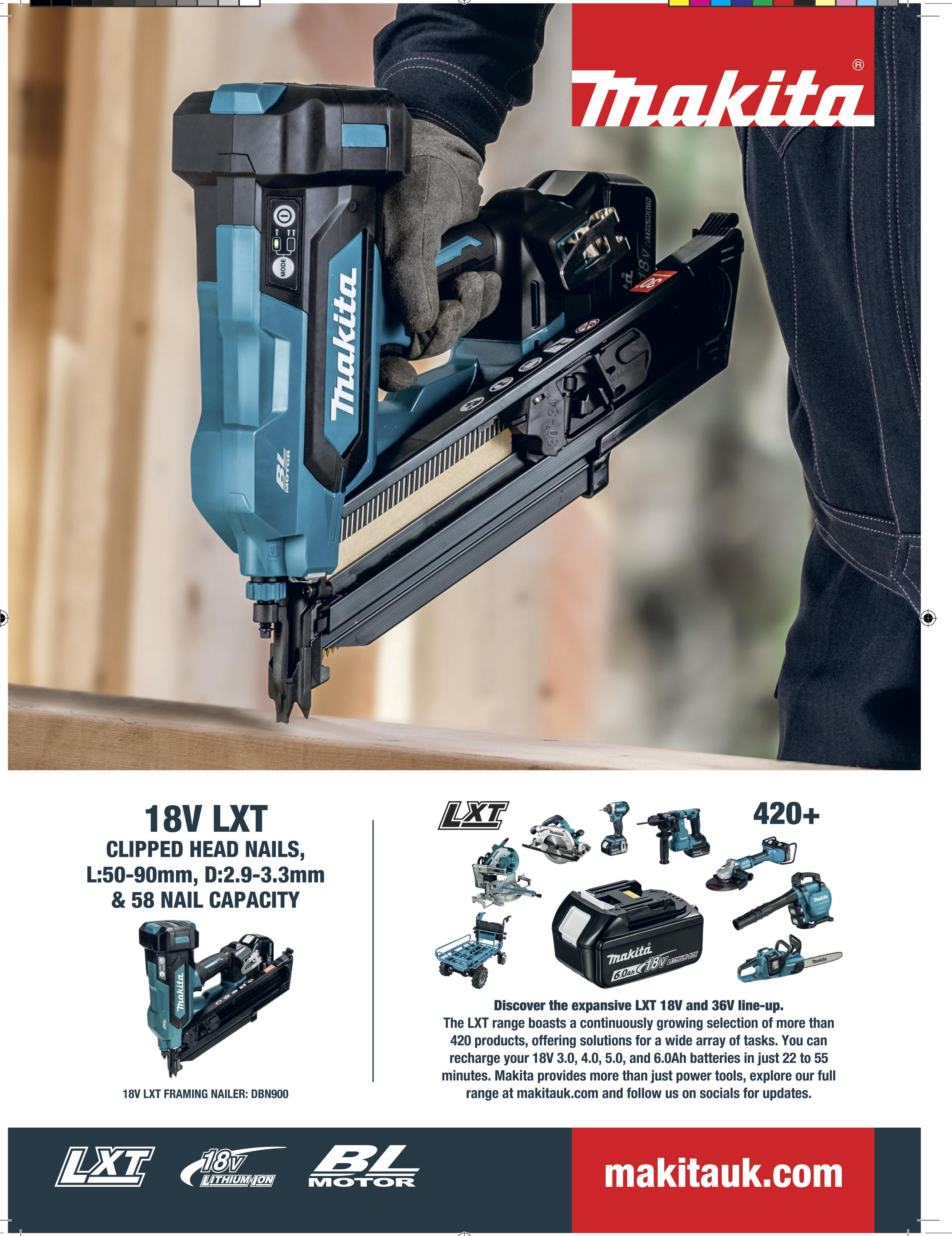 Designed specifically for first fix framing applications, the Makita LXT can be used in the same way as a pneumatic nailer but without the additional setup time, complication and restriction of a compressor and air lines. In addition, unlike gas nailers, the DBN900 has no additional consumables, reducing the cost and inconvenience of replacing the cartridges.