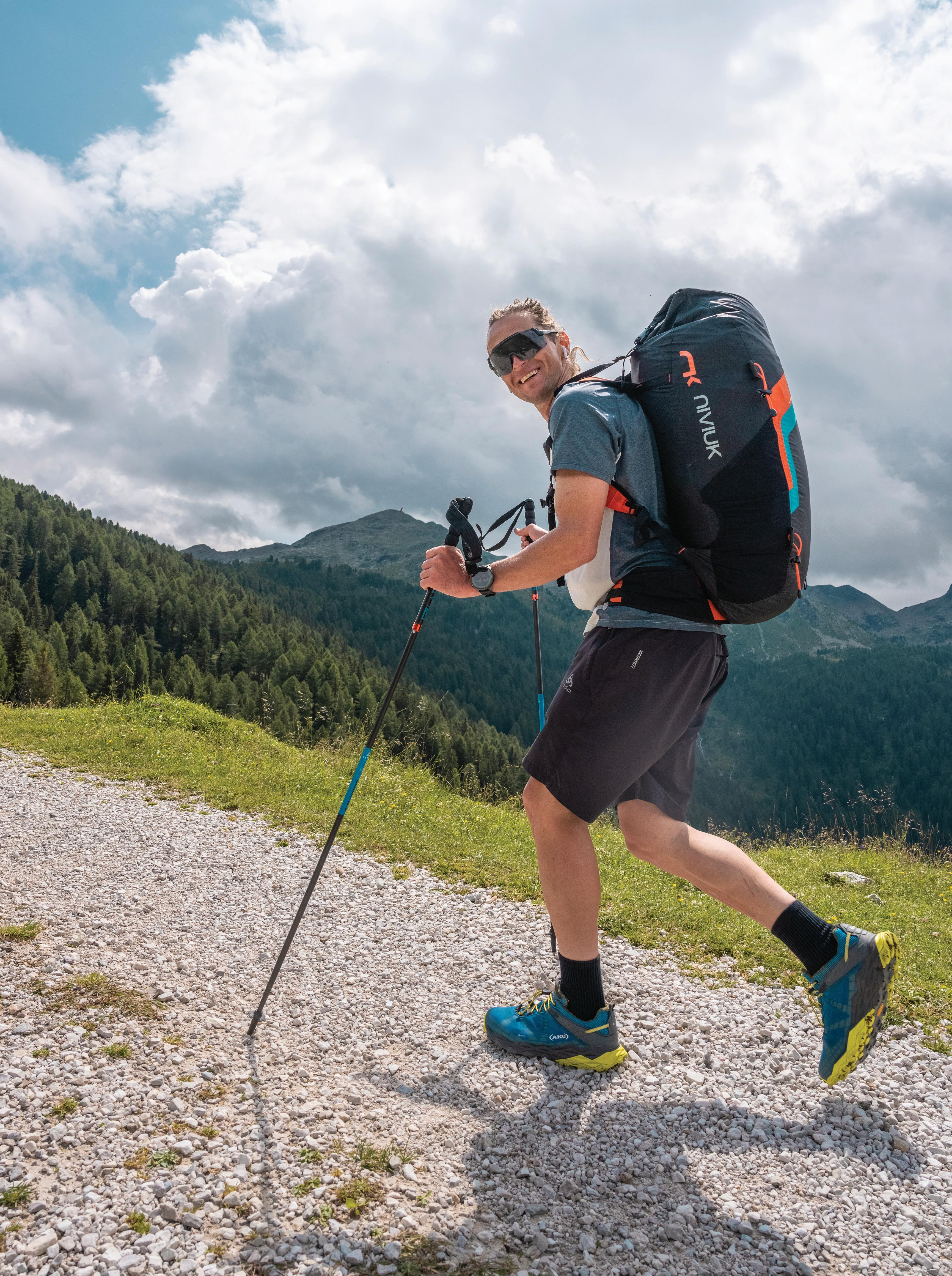 come in tutte le gare, il primo che arriva vince. Si parte dall’Austria a si attraversano le Alpi da nord toccando Germania, Svizzera e Francia, si gira attorno al Monte Bianco e si torna da sud in Italia e poi di nuovo Austria. É un giro che ti stanchi anche solo a pensarlo. È pesante per noi, che ci possiamo spostare in auto, lo è per gli atleti che possono contare soltanto sulle proprie energie. Quest’anno il meteo per fortuna era buono e si è volato parecchio, ma questo non ha evitato ad Eli almeno 2000 metri di dislivello al giorno. Ogni atleta deve portare sempre con sé la propria vela, l’imbrago, il casco e altri strumenti obbligatori. Per portare il resto ci sono i supporter.