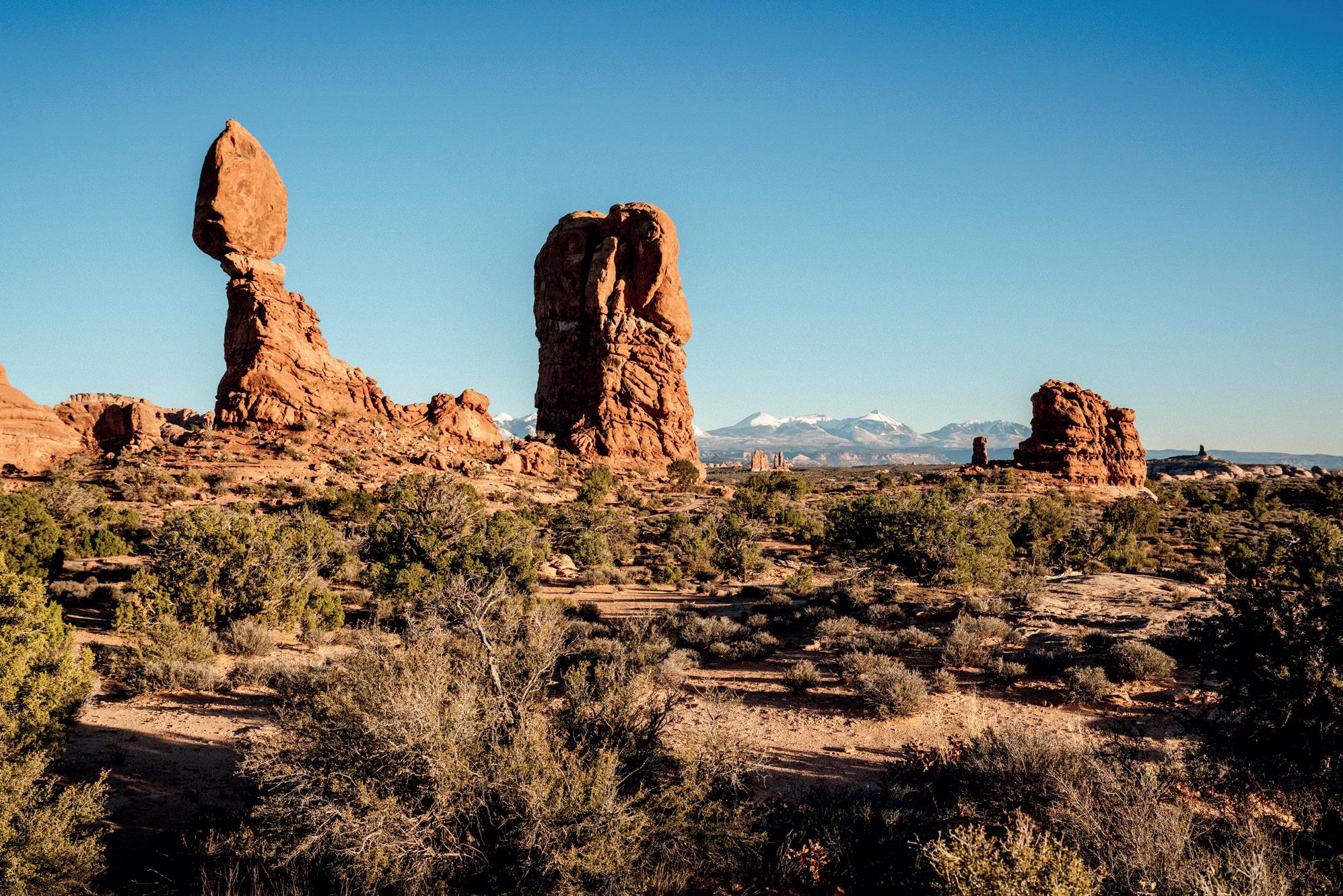 Utah is a prehistoric land and the secondary colors haven't reached it yet. You realize you've never really seen a blue sky until you see Arches. It is famous for its granite arches but the really striking thing is their colour. In Moab you get the impression that every other shade has disappeared from the universe: there is no brick red, olive green, cornflower blue. There is red and blue, and only to a small extent the green of the shrubs and the yellow of the birches, that's enough. Near Arches, the Colorado Plateau includes five other National Parks: Zion, Bryce Canyon, Canyonlands, Capital Reef, and Monument Valley, and what you can find there is pretty much the same: red and blue, and white mountains four thousand miles away, clearly visible as if they were next door. Indeed, the Parks risk turning any photographer into a landscaper, but not Denis. Denis has been shooting for too long and knows too well what he needs, and he's not the type to waste time with a blue sky, «look for it on Google». In any case, making distances seems an impossible feat, for the rest a little red is enough, a little blue, et voilà.