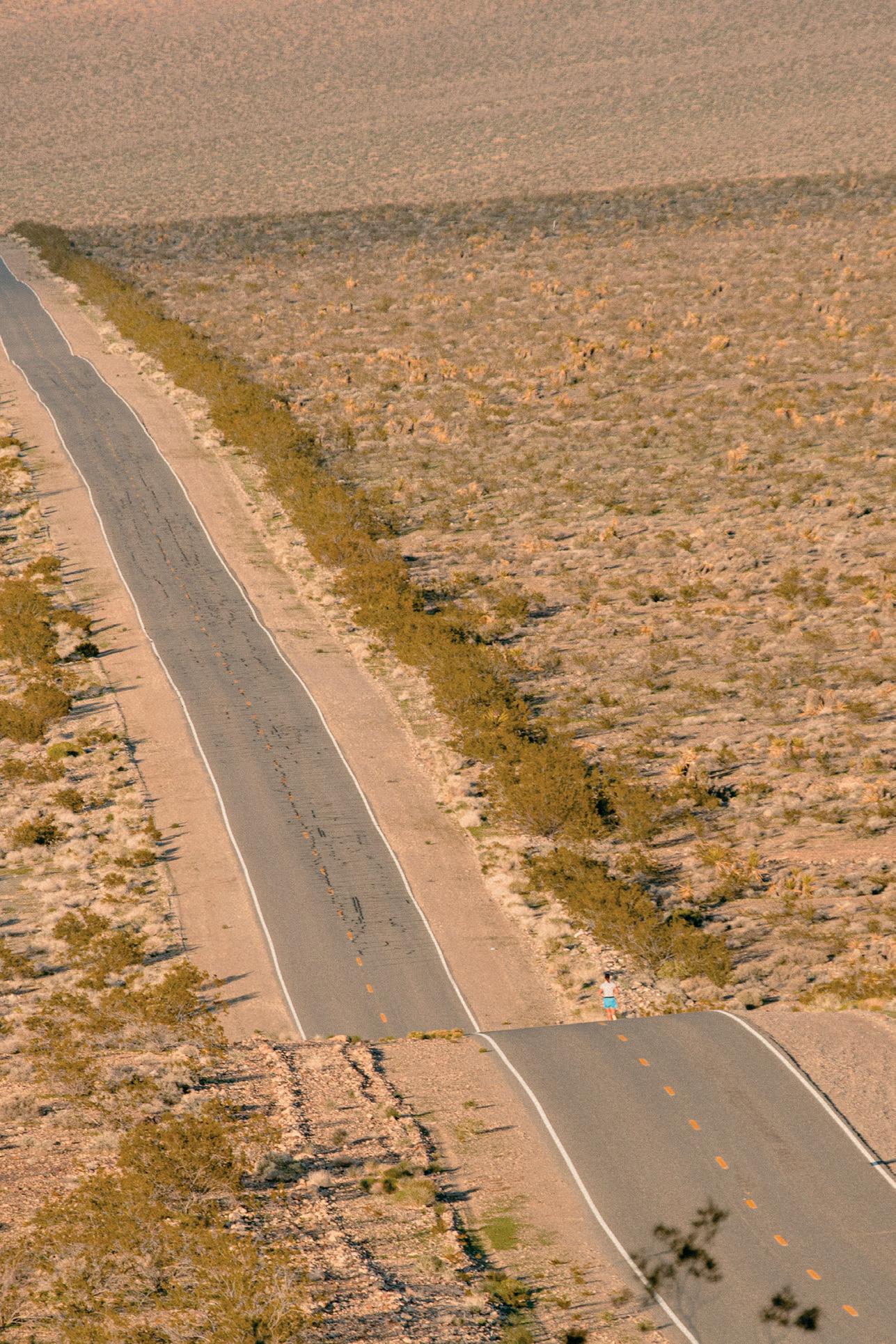main visible element of anthropization: the human presence is so absent as to seem tangible. Indeed, beyond the sublime effect of distance, the National Parks are vaguely reminiscent of Disneyland. They are mostly visited by car, along roads served by service lay-bys. It must be said that American roads are completely devoid of decorative elements such as reflectors and guardrails, making them less intrusive than ours.
