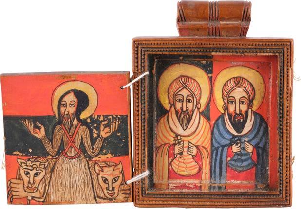 362 | 4 TEILIGES KONVOLUT: HEILIGER NIL STOLOBENSKIJ, FINIFT MIT DEM HEILIGEN HERMOGEN, PATRIARCH VON MOSKAU, HAUSKREUZ UND TRIPTYCHON MIT DEM HEILIGEN NIKOLAUS VON MYRA
