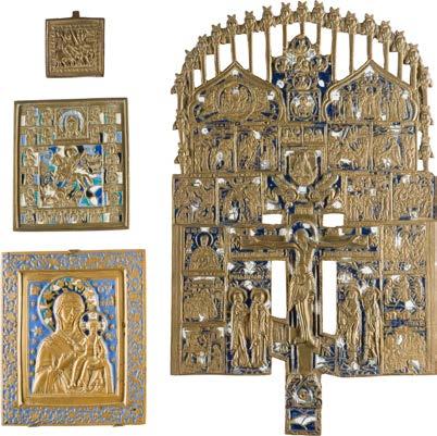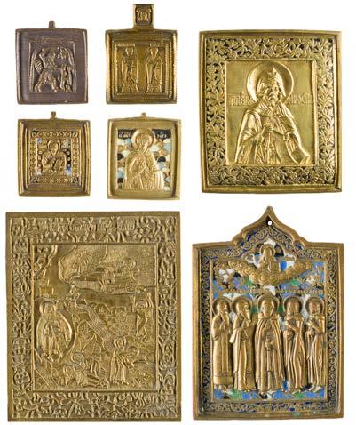 Bronze, reliefiert gegossen, teils emailliert in Blau. H. 5,6-15,7 cm. Email min. best., ein Triptychon mit Hl. Tichon mit Fehlstelle im Guss.