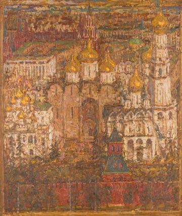 Porzellan, polychrome Aufglasurbemalung, Goldstaffage. D. 35,5 cm. Unten rechts in Kyrillisch signiert und datiert ‚Katarskij 1915‘, auf der Unterseite blaue Manufakturmarke, Datierung ‚1915‘, Monogramm ‚K.‘ sowie Pressmarke ‚14‘. Min. best.