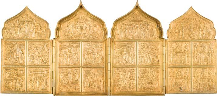 A FINE BRASS TETRAPTYCH SHOWING LITURGICAL FEASTS OF THE ORTHODOX CHURCH YEAR
