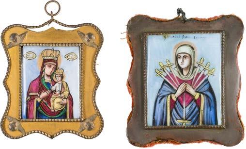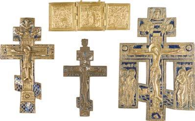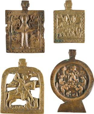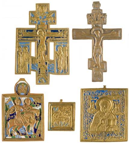 Cast in relief, partially multi-coloured enamelled. Enamel min. chipped, an icon showing St. George dam. above. 5.6-17.5 cm high.