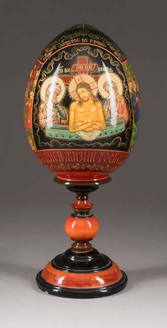Russland, 19. Jh. / nach 1912 Holz, vollplastisch geschnitzt, Email auf Metall, Bronze, reliefiert gegossen. H. 6,721,6 cm. Email mit Haarrissen.
