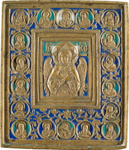 Bronze, reliefiert gegossen, teils mehrfarbig emailliert. H. 5,211 cm. Ikone mit Christus von Smolensk mit kleinem Riss.
