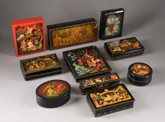 Porzellan, Aufglasur-Chromolithografie, teils mit Goldstaffage. L. 1640,4 cm. Jew. auf der Unterseite mit Manufakturmarke sowie Bez. in Kyrillisch ‚Nach orig. Zeichnung von N. Karasin. Reproduktion verboten‘. Ränder part. berieben, ein Teller min. best.