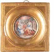 Gouache auf Papier, montiert auf Karton. D. 45 cm (R. 9,5 x 9,5 cm). Fein ausgeführte Darstellungen der Gaben bringenden Heiligen drei Könige und der Beschneidung Christi in Interieurs. Leicht ber. Hinter Glas in vergoldeten Holzrahmen.