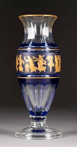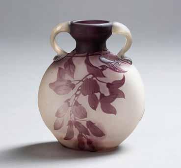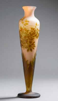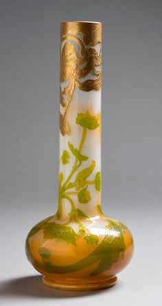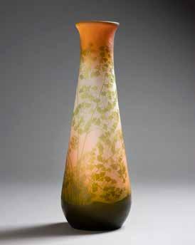 Farbloses Glas, grüner Überfang, rosa Unterfang, Ätzdekor. H. 50 cm. Auf Wandung bez. ‚Gallé‘ mit Stern (hochgeätzt). Sehr min. Gebrauchsspuren.